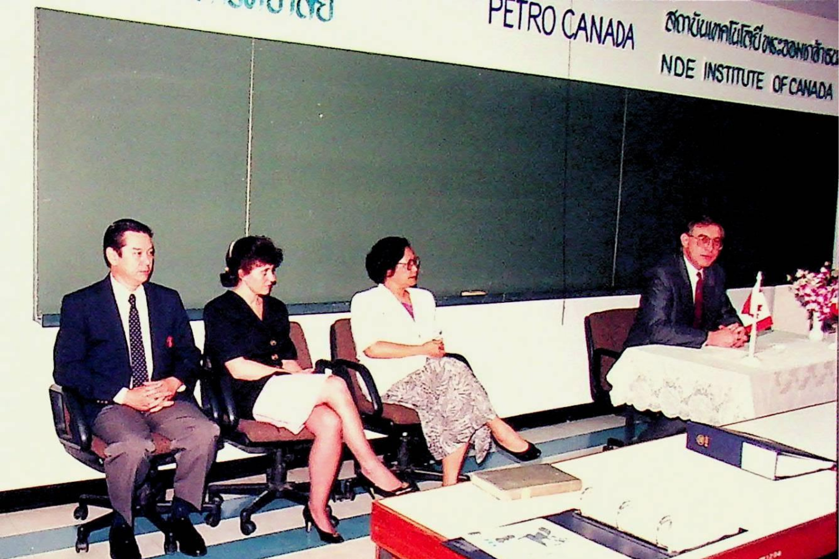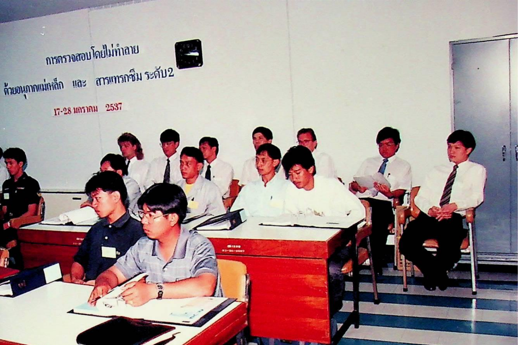 Title: สถาบันเทคโนโลยีพระจอมเกล้าธนบุรี ร่วมกับสถาบันปิโตรเลียมแห่งประเทศไทย, จุฬาลงกรณ์มหาวิทยาลัย, Petro Canada และ NDE Institute of Canada จัดอบรมเชิงปฏิบัติการเรื่อง การตรวจสอบโดยไม่ทำลายด้วยอนุภาคแม่เหล็ก และสารแทรกซึม ระดับ 2 ระหว่างวันที่ 17-28 มกราคม 2537 โดยเชิญคุณหญิงทองทิพ รัตนรัต ประธานสถาบันปิโตรเลียมแห่งประเทศไทย มาเป็นประธานเปิด