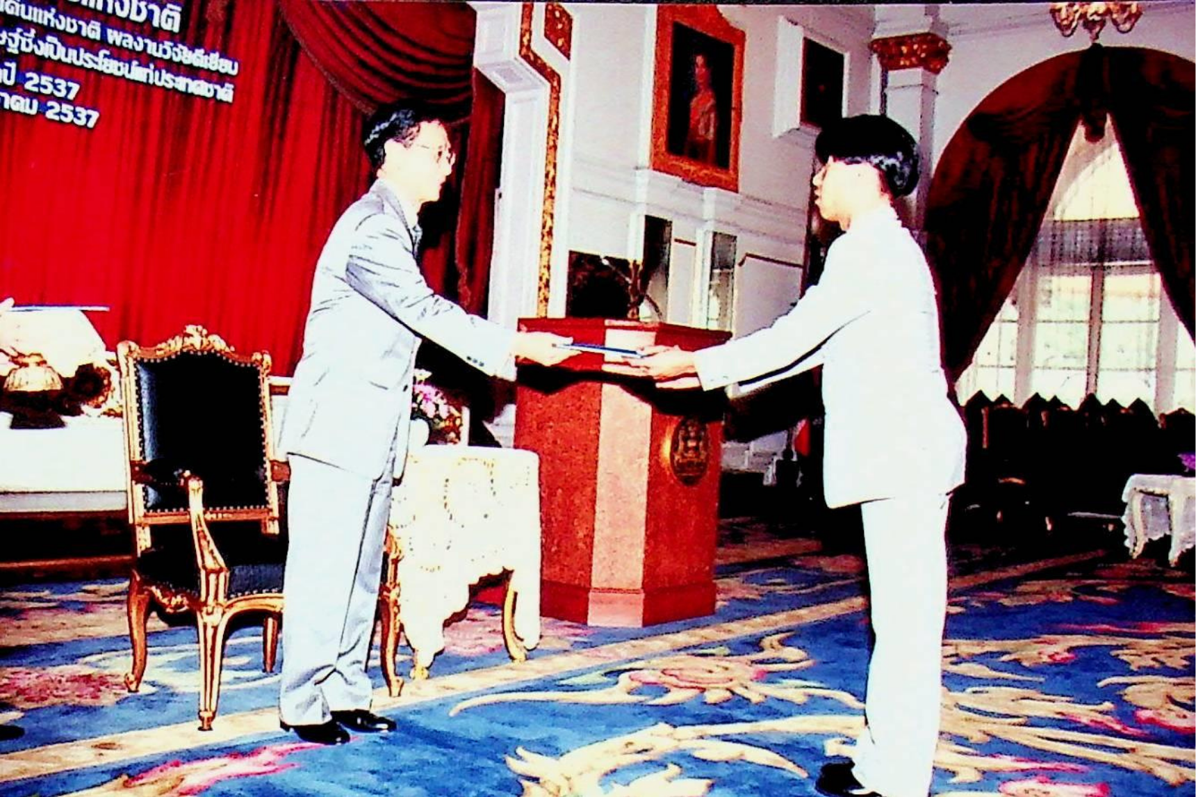 https://modps71.lib.kmutt.ac.th/xmlui//handle/123456789/1670| Title: | รศ.ดร.พิเชษฐ ลิมสุวรรณ และคณะ เข้ารับรางวัลชมเชย ผลงานคิดค้น หรือสิ่งประดิษฐ์ซึ่งเป็นประโยชน์ต่อประเทศชาติ ประจำปี 2537 เรื่อง การสร้างและพัฒนาเตาไฟฟ้าอุณหภูมิสูง สำหรับใช้ในการเผาพลอย จาก พณฯ ชวน หลีกภัย นายกรัฐมนตรี |