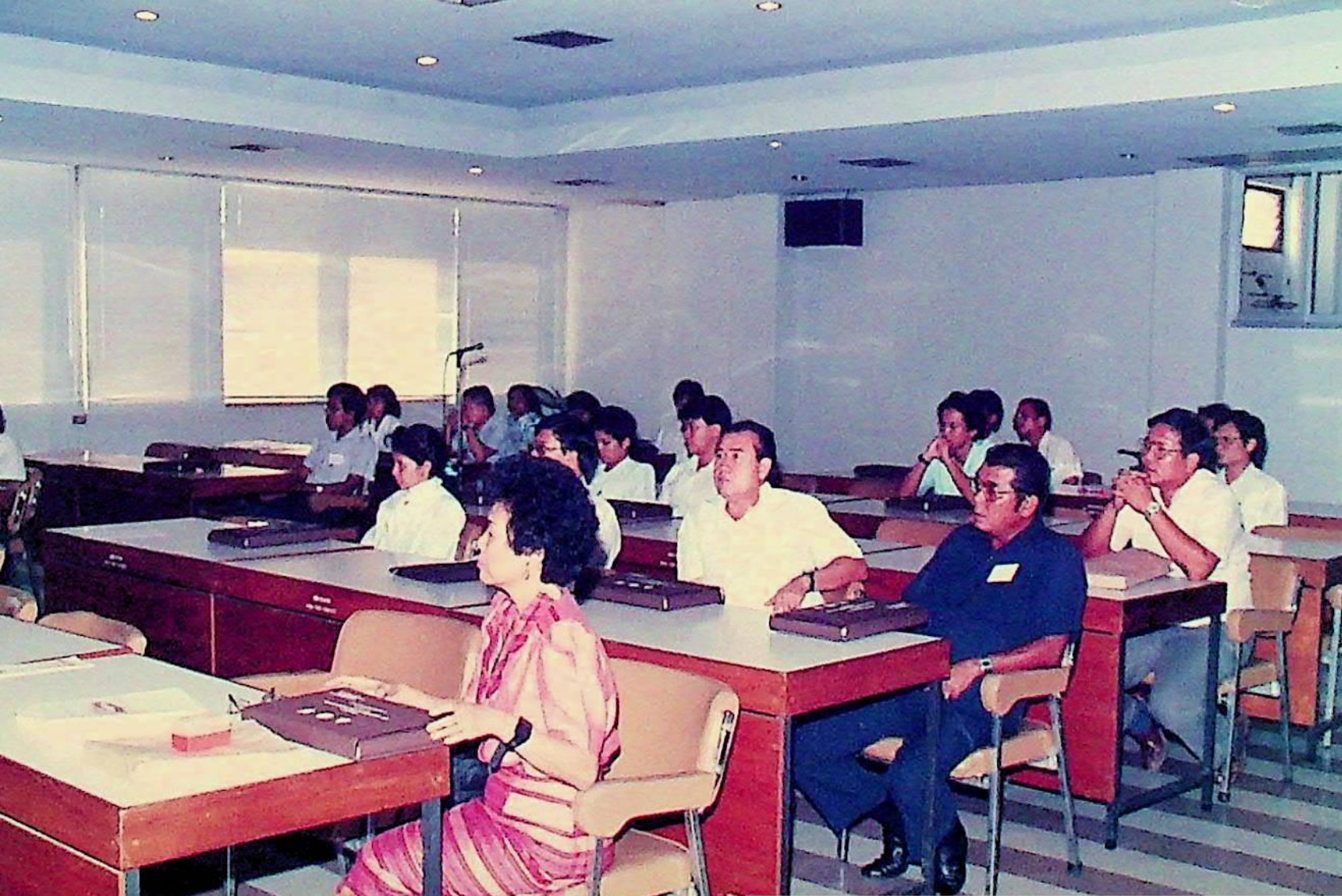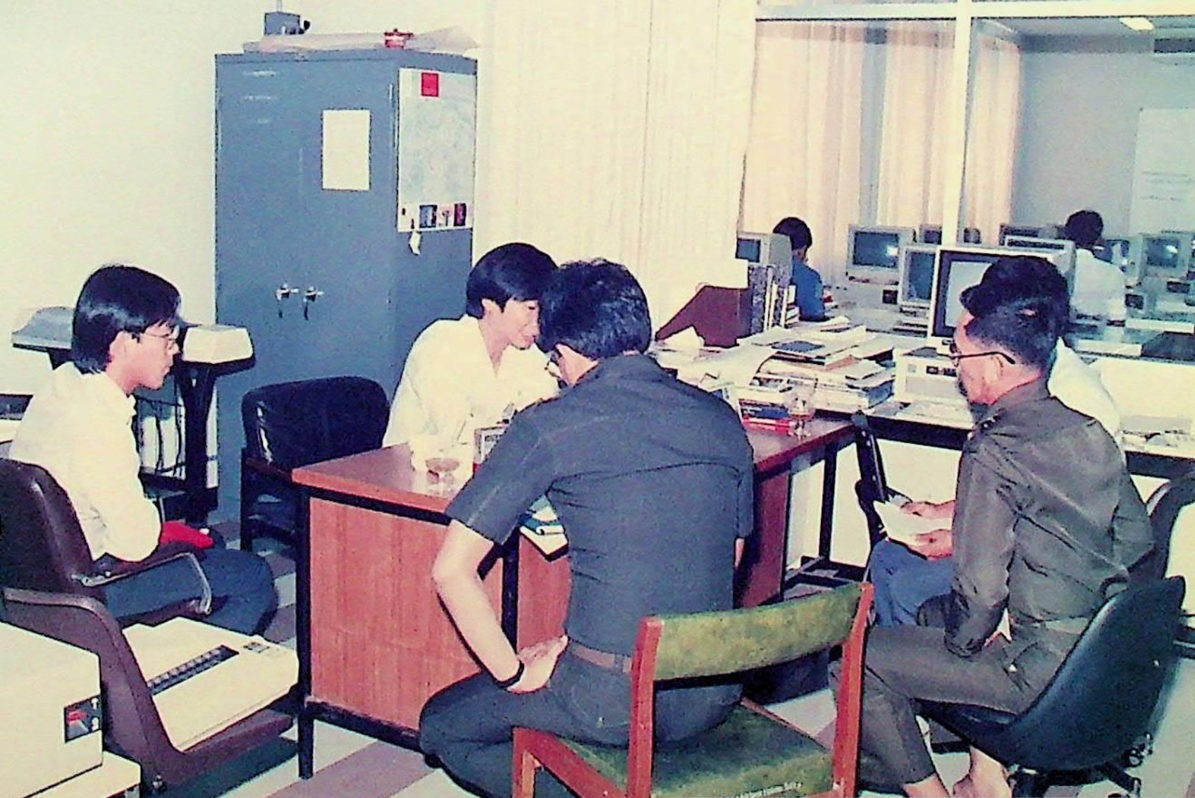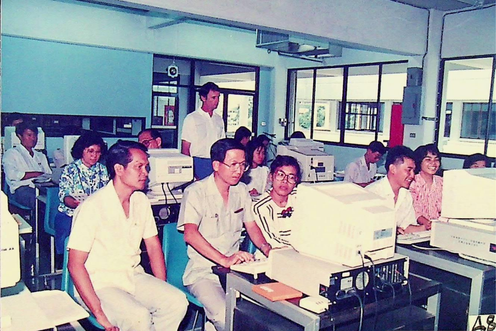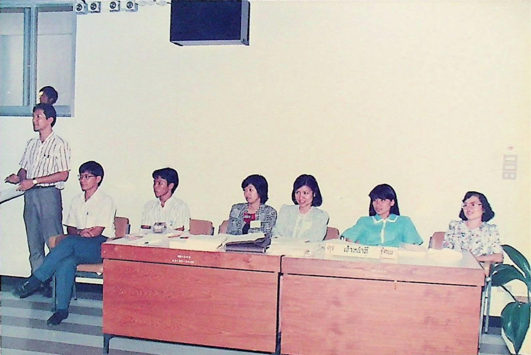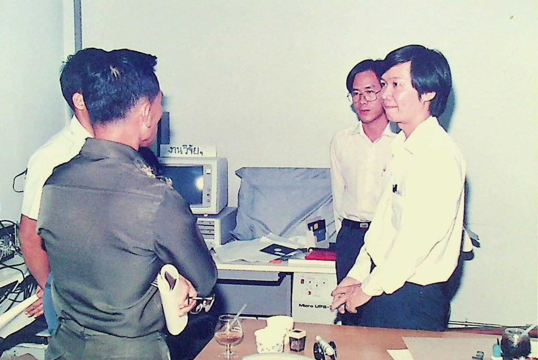 คณะนายทหารจากกองวิจัยและพัฒนา กรมการศึกษาวิจัย บก.สูงสุด เข้าชม Expert System โดยมีอาจารย์บุญเจริญ ศิริเนาวกุล และอาจารย์พิพัฒน์ ศุภศิริสันต์ ให้รายละเอียด ณ ศูนย์คอมพิวเตอร์ ในวันที่ 21 เมษายน 2532 จากภาพถ่ายอัลบั้มที่ 3217