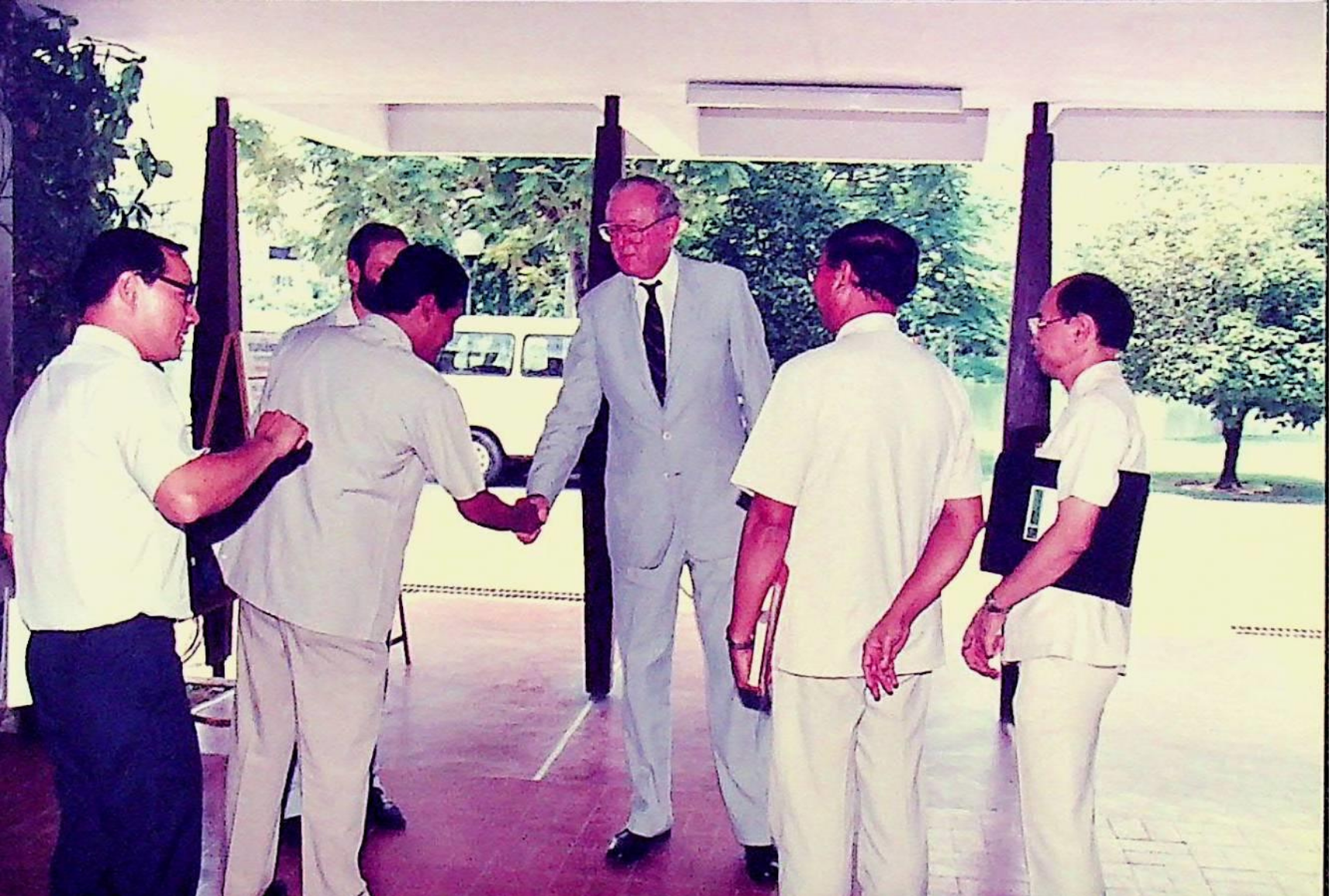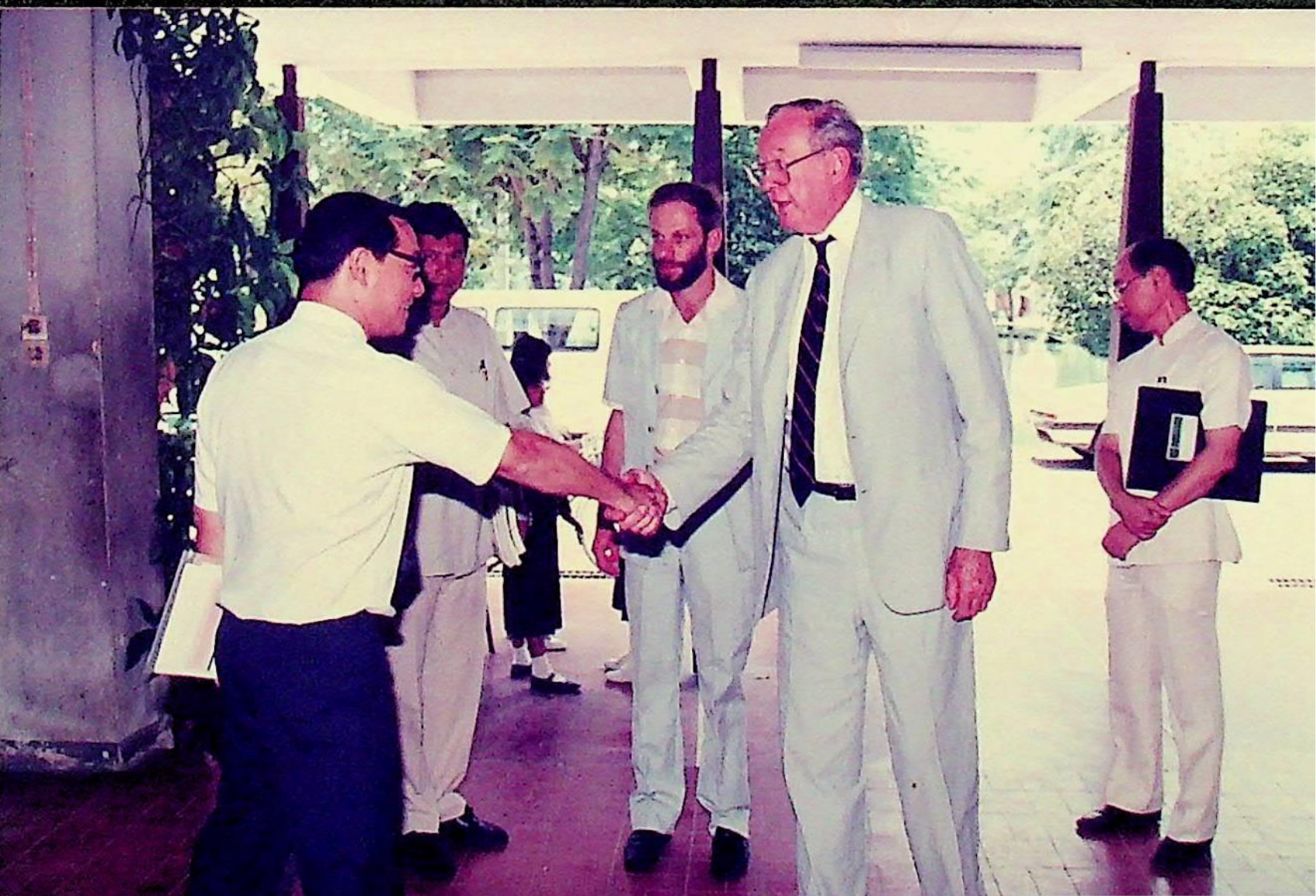 Mr. Walter Handmer ผู้แทนจาก Curtin University of Technology, Perth ประเทศออสเตรเลีย เจรจาความร่วมมือกับคณะวิศวกรรมศาสตร์ ตามโครงการแลกเปลี่ยนอาจารย์ และการจัดหลักสูตรร่วมกัน ณ ภาควิชาวิศวกรรมโยธา ในวันที่ 7 สิงหาคม 2532 จากภาพถ่ายอัลบั้มที่ 3229