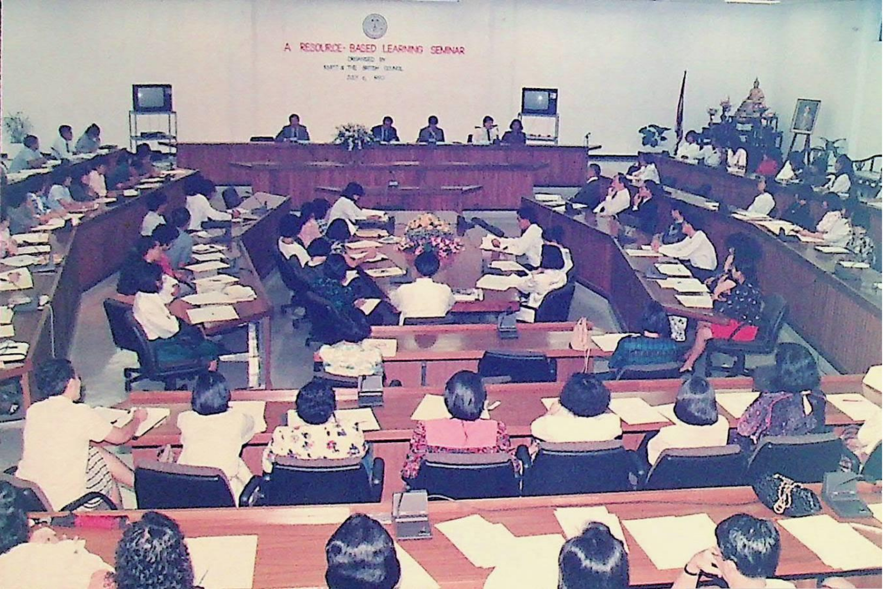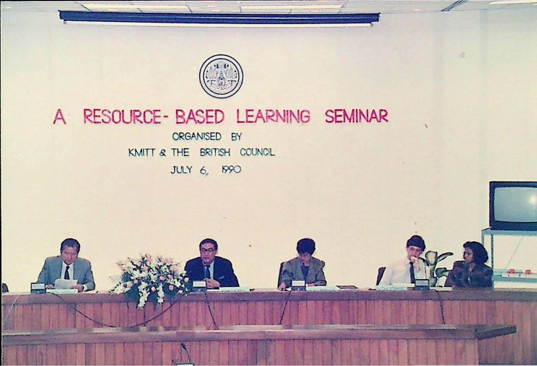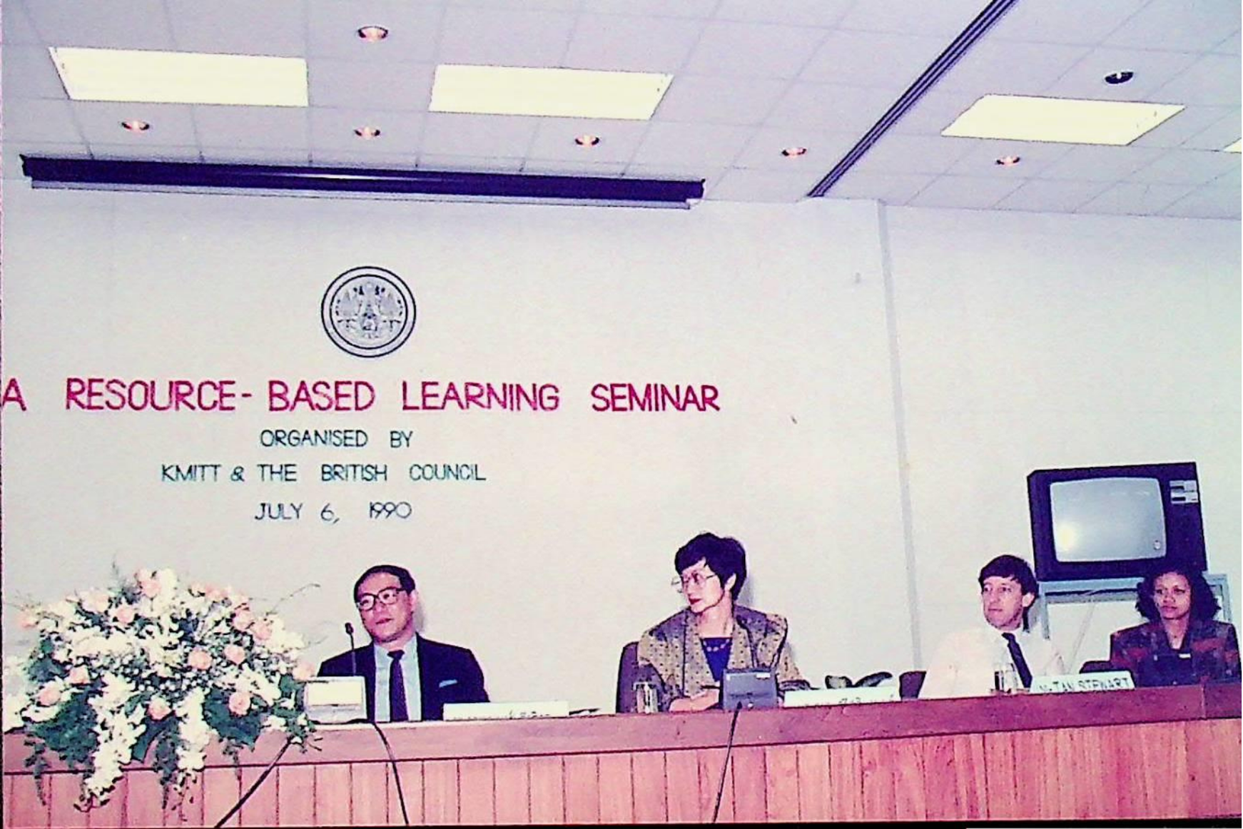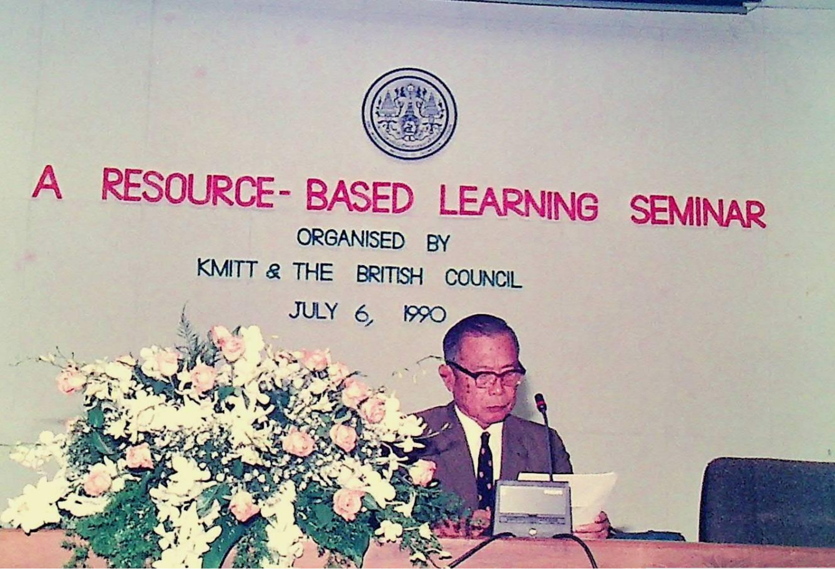 นายกสภาสถาบันเป็นประธานเปิดการสัมมนาเพื่อระดมความคิดในชาติเรื่อง การเรียนแบบพึ่งตนเอง จัดโดยภาควิชาภาษาและสังคม ร่วมกับบริติช เคานซิล ผู้บรรยายประกอบด้วย ดร.โกวิท วรพิพัฒน์ อธิบดีกรมสามัญศึกษา, ดร.กฤษณพงศ์ กีรติกร รองอธิการบดีฝ่ายวิจัยฯ, Mr. Ian Stewart และ Mr. Lesie Dikinson ณ ห้อง C B.2202  ในวันที 6 กรกฎาคม 2533 จากภาพถ่าย 3339 และ 3340