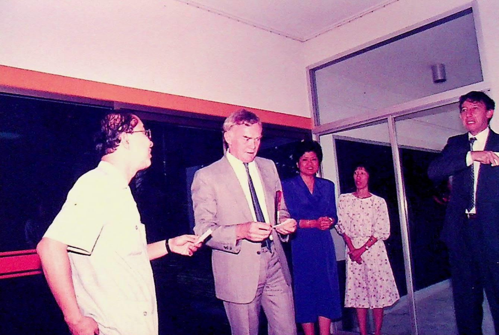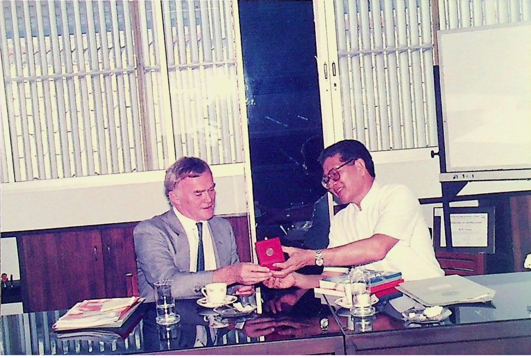 Mr. Peter Moss ซึ่งเป็น Representative คนใหม่ และ Mr. Ian Stewart ซึ่งเป็น English Language Officer จาก British Council เข้าพบอธิการบดีและเยี่ยมชมสถาบัน ณ สํานักงานอธิการบดี ในวันที่ 10 ตุลาคม 2533 จากภาพถ่ายอัลบั้มที่ 3357