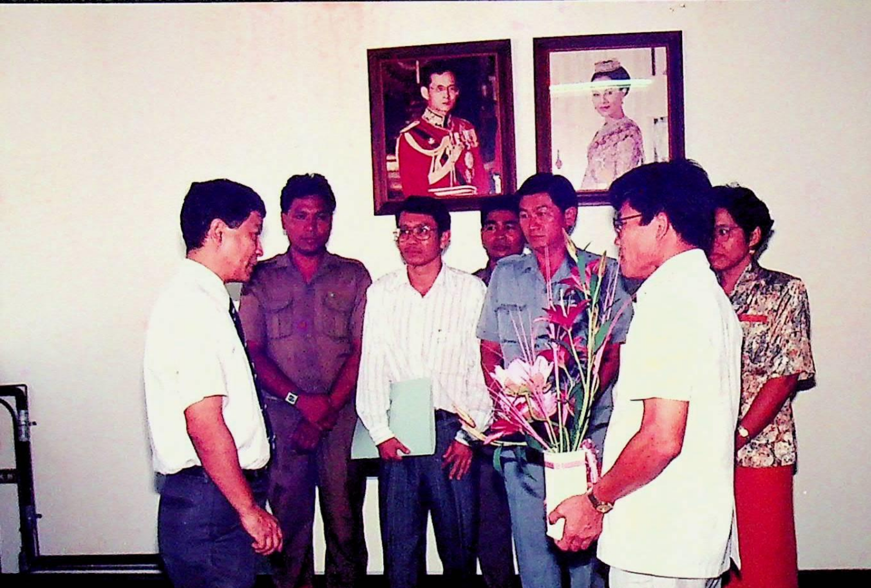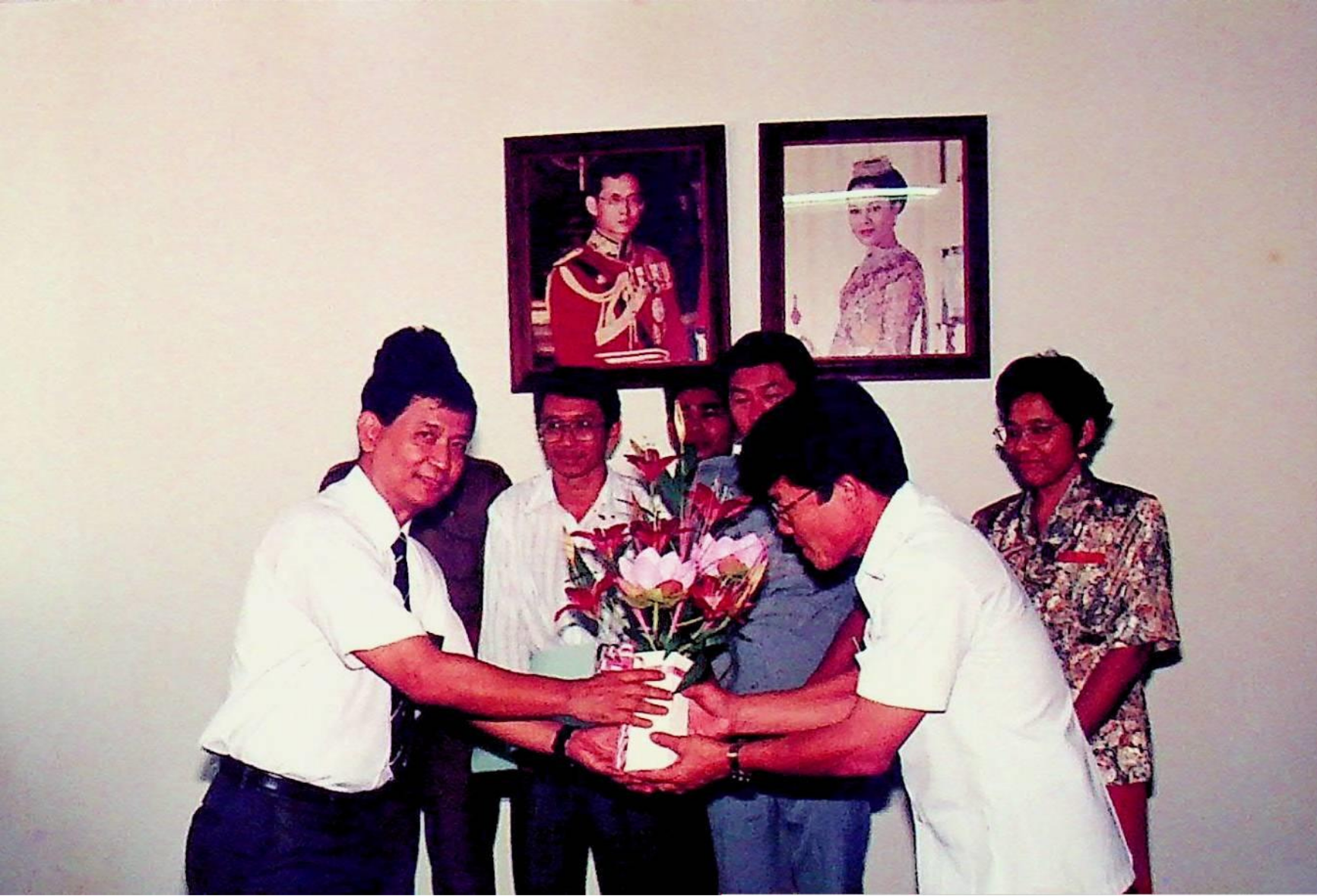 คณะกรรมการสหกรณ์ออมทรัพย์สถาบันเทคโนโลยีพระจอมเกล้าธนบุรี จำกัด นำกระเช้าดอกไม้เข้าแสดงความยินดีกับ รศ.ดร.หริส สูตะบุตร เนื่องในโอกาสได้รับเลือกให้ดำรงตำแหน่งอธิการบดี ณ ห้องอธิการบดี ในเดือนกรกฎาคม 2535 จากภาพถ่ายอัลบั้มที่ 3531