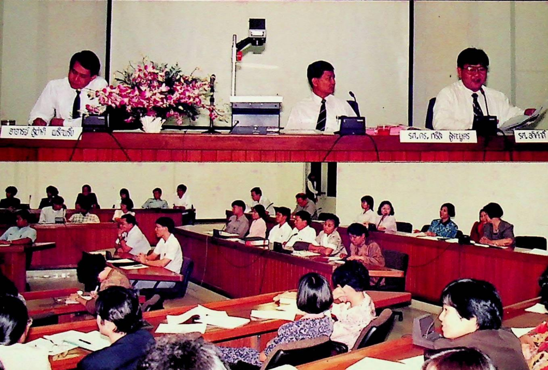 สภาคณาจารย์ สถาบันเทคโนโลยีพระจอมเกล้าธนบุรี จัดให้มีการอภิปรายเรื่อง อธิการบดีพบอาจารย์และข้าราชการของสถาบัน ณ ห้องประชุมจํารัส ฉายะพงศ์ โดยมีผู้ร่วมอภิปรายประกอบด้วย อธิการบดี และรองอธิการบดีฝ่ายต่าง ๆ และมี รศ.อดิศักดิ์ พงษ์พูลผลศักดิ์ ประธานสภาคณาจารย์ เป็นผู้ดำเนินการอภิปราย ในวันพฤหัสบดีที่ 6 สิงหาคม 2535 จากภาพถ่ายอัลบั้มที่ 3533