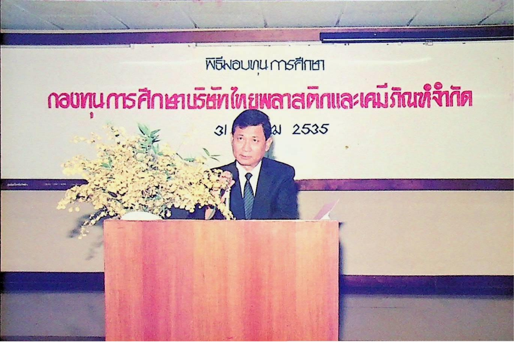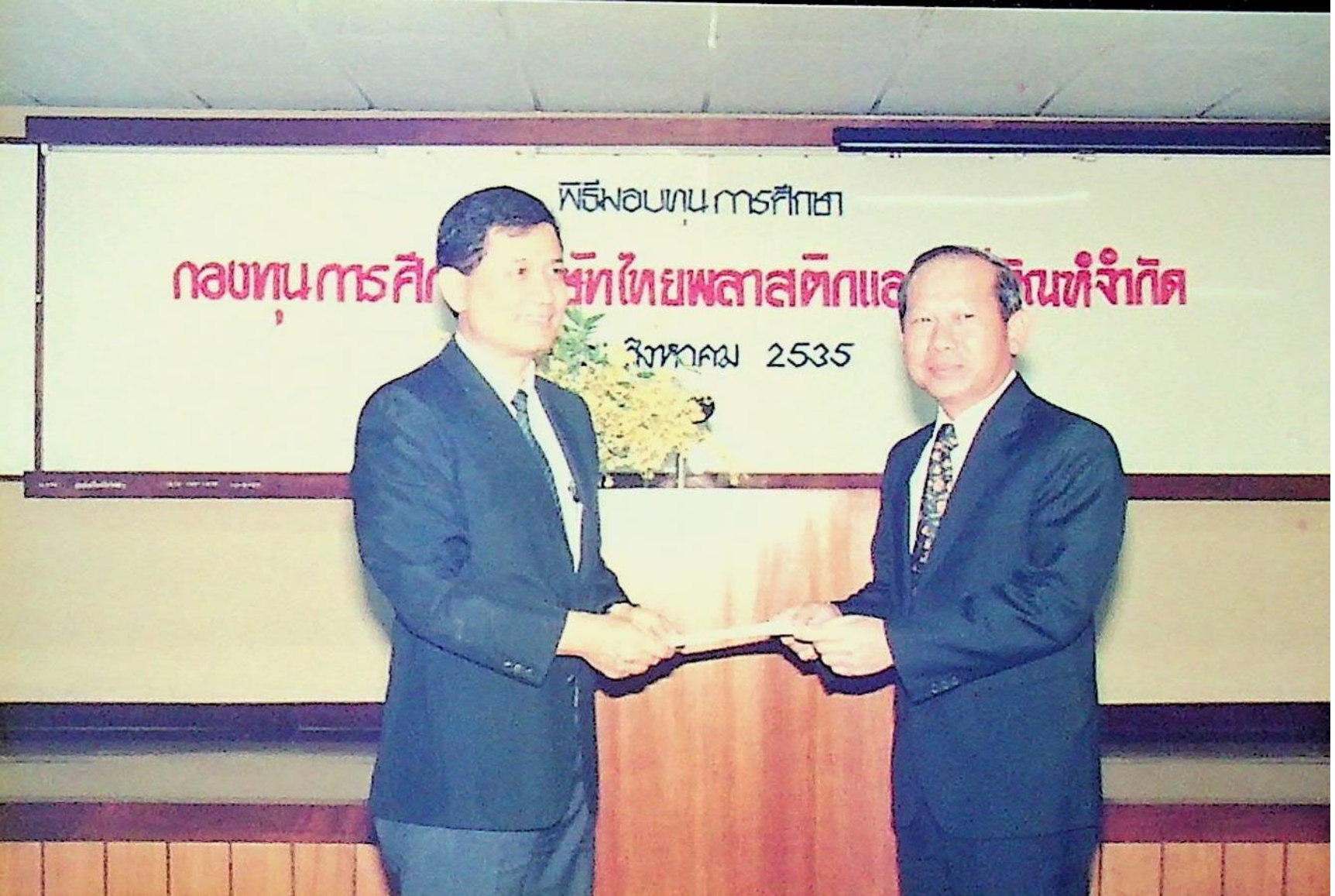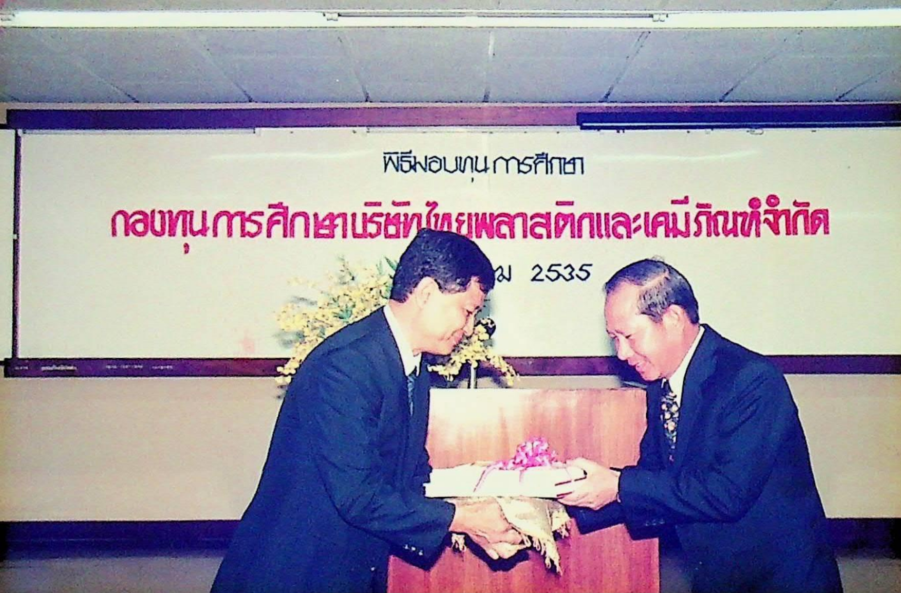 รศ.ดร.หริส สูตะบุตร อธิการบดีสถาบันเทคโนโลยีพระจอมเกล้าธนบุรี เป็นประธานพิธี รับมอบทุนการศึกษาของกองทุนการศึกษา บริษัท ไทยพลาสติกและเคมีภัณฑ์ จำกัด ประจำปี การศึกษา 2535 โดยคุณไพฑูรย์ ปานสูง ผู้อำนวยการฝ่ายบริหารกลาง เป็นผู้มอบ
