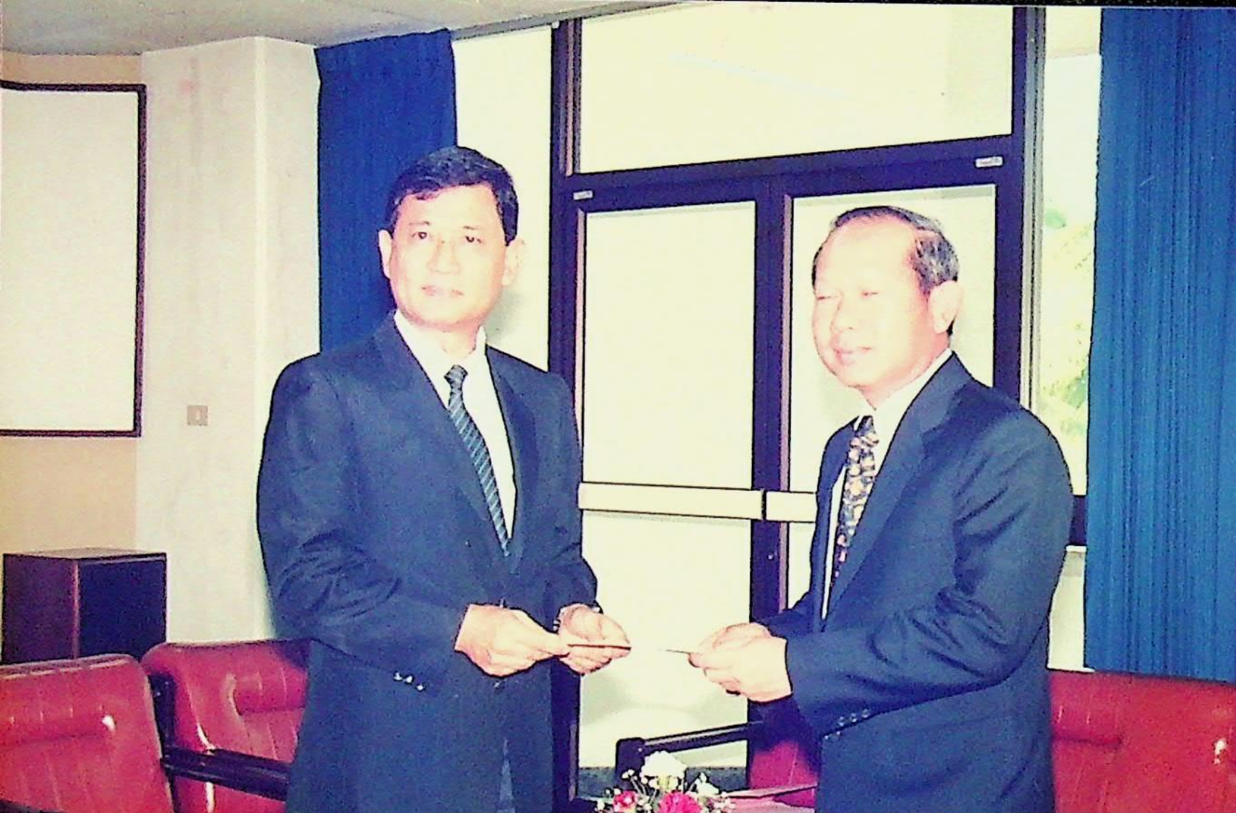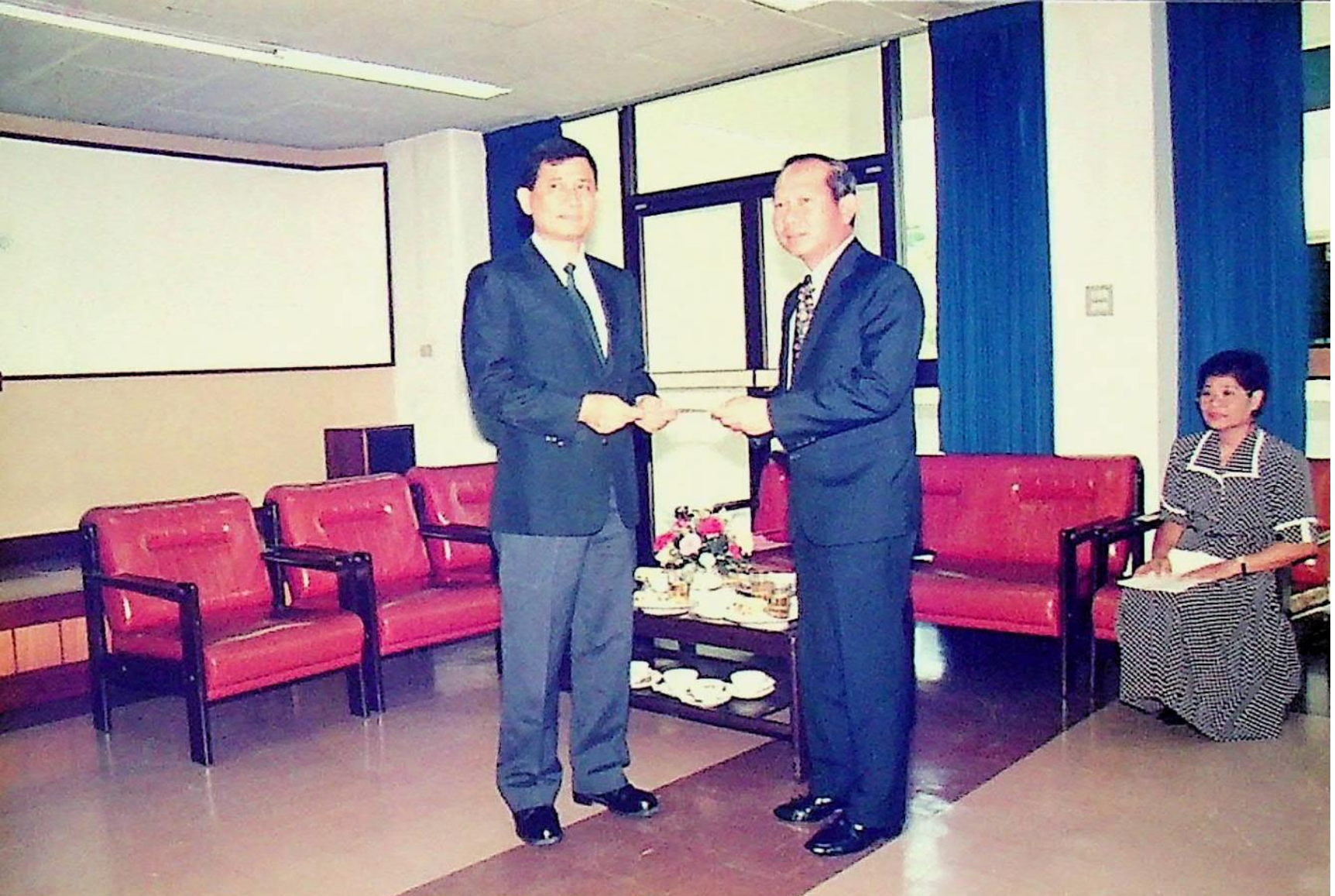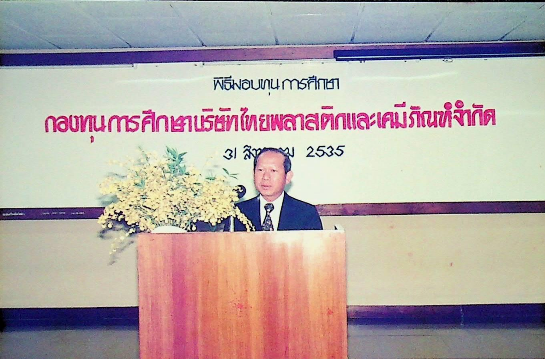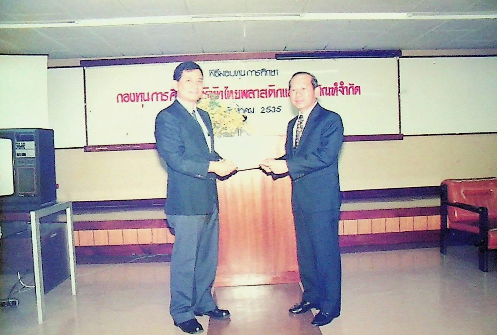 รศ.ดร.หริส สูตะบุตร อธิการบดีสถาบันเทคโนโลยีพระจอมเกล้าธนบุรี เป็นประธานพิธี รับมอบทุนการศึกษาของกองทุนการศึกษา บริษัท ไทยพลาสติกและเคมีภัณฑ์ จำกัด ประจำปี การศึกษา 2535 โดยคุณไพฑูรย์ ปานสูง ผู้อำนวยการฝ่ายบริหารกลาง เป็นผู้มอบ
