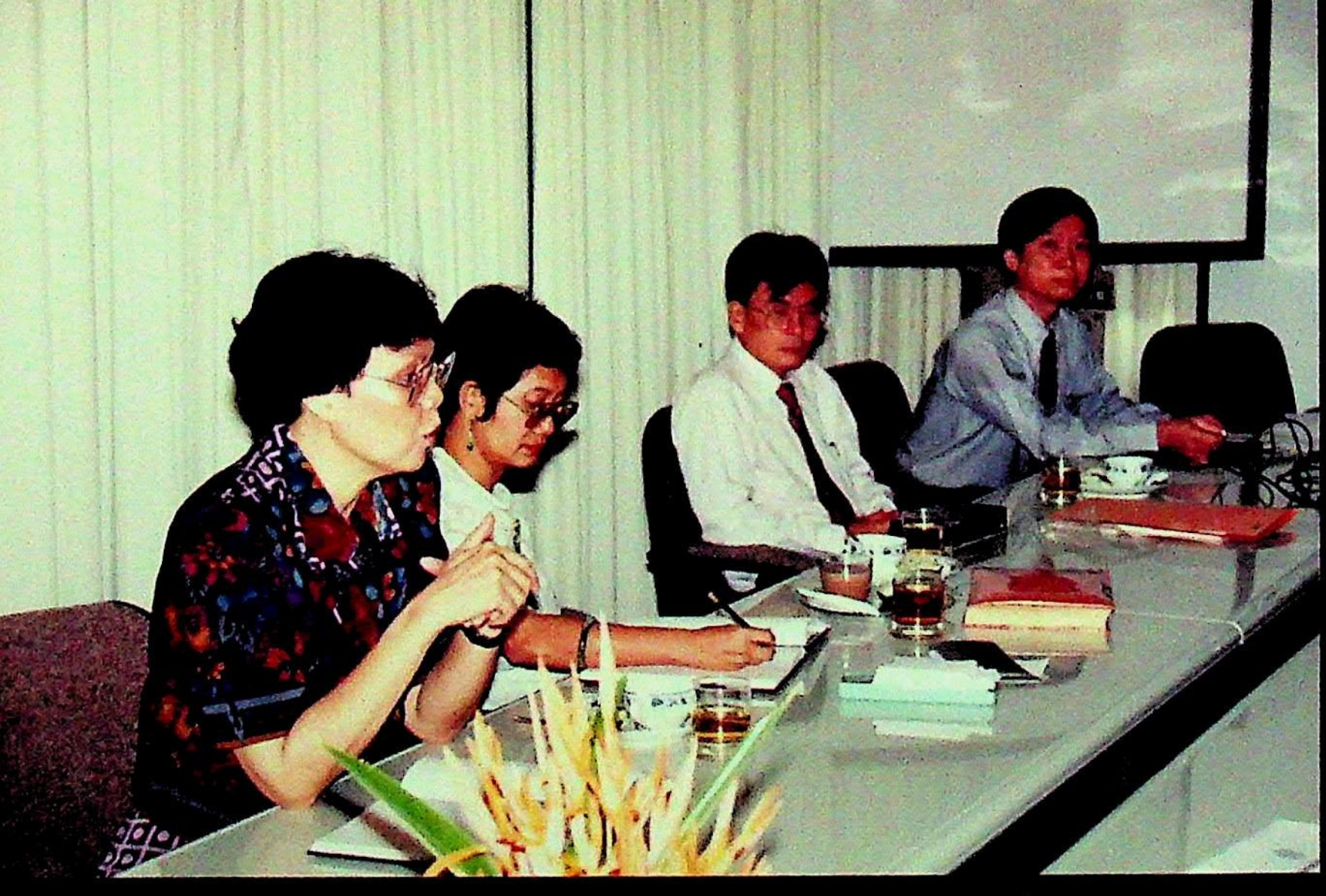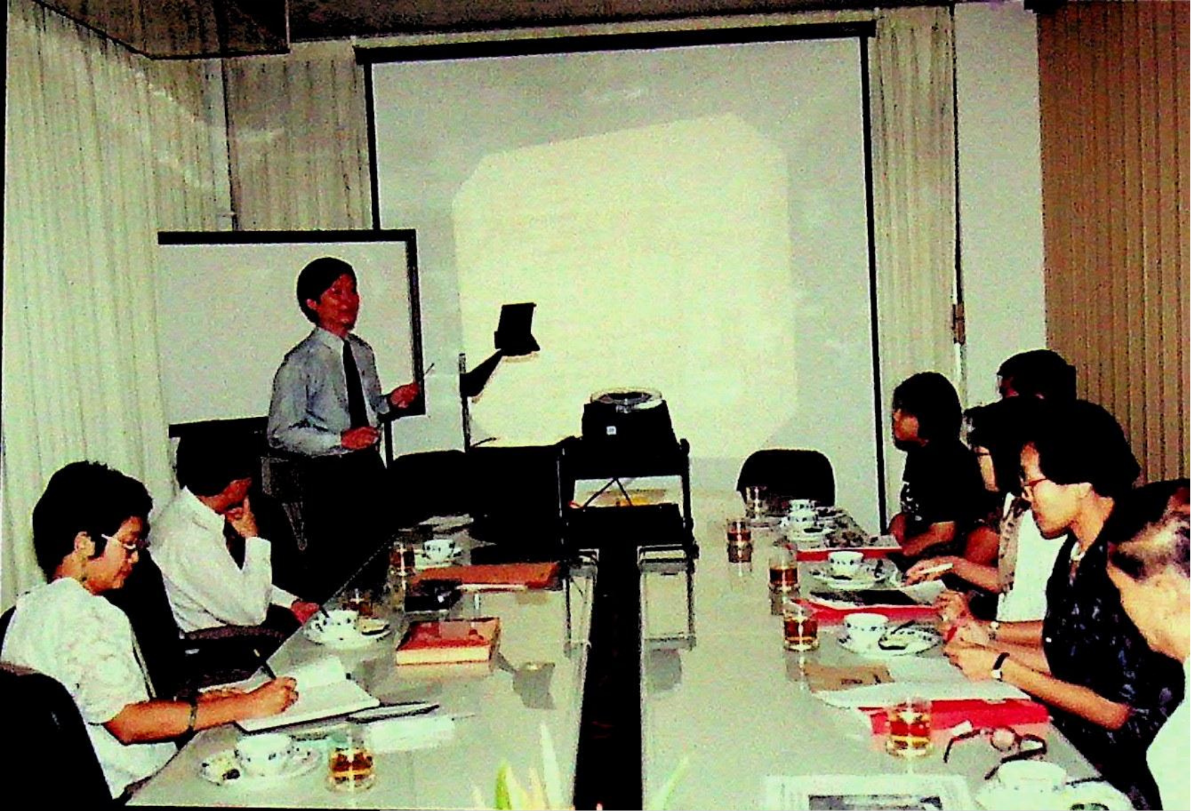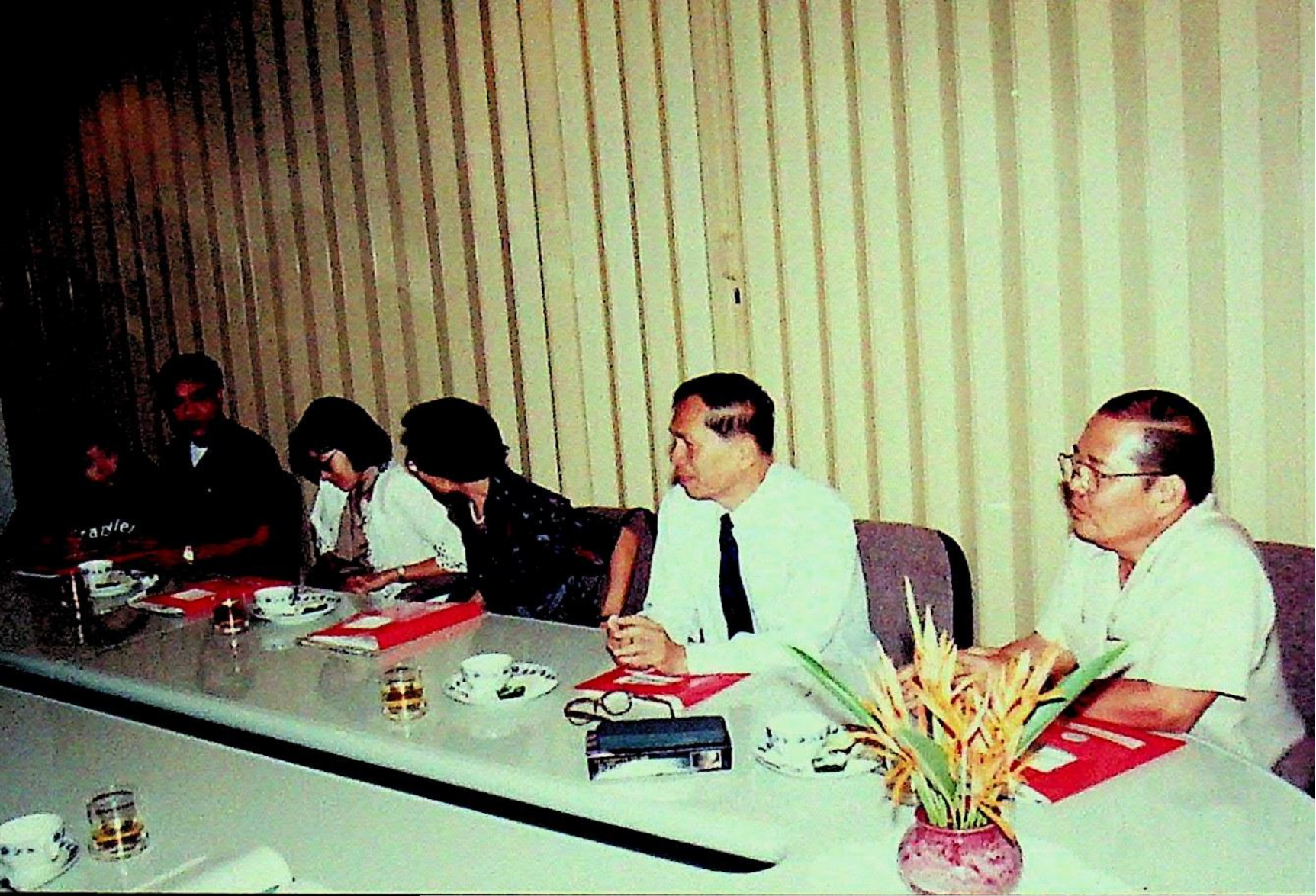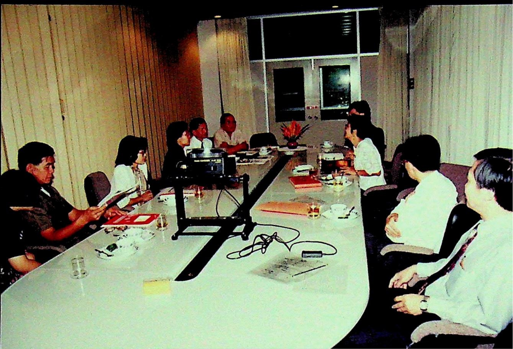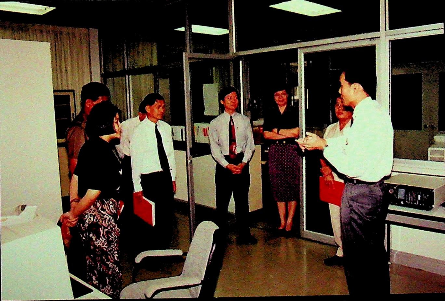 ศ.ดร.สมชาติ โสภณรณฤทธิ์ รองอธิการบดีฝ่ายวิจัยและวิเทศสัมพันธ์ และคณะ ให้การต้อนรับ พ.ต.บัญชา ไชยปาติยุทธ ผู้อำนวยการกองกลาง สำนักราชเลขาธิการ และคณะมาทดสอบการใช้งาน ดิคชันนาเรเตอร์ ก่อนนำเครื่องขึ้นทูลเกล้าถวาย พระบาทสมเด็จพระเจ้าอยู่หัว ณ ห้องประชุม สํานักคอมพิวเตอร์ ในวันพุธที่ 10 มีนาคม 2536 จากภาพถ่ายอัลบั้มที่ 3616