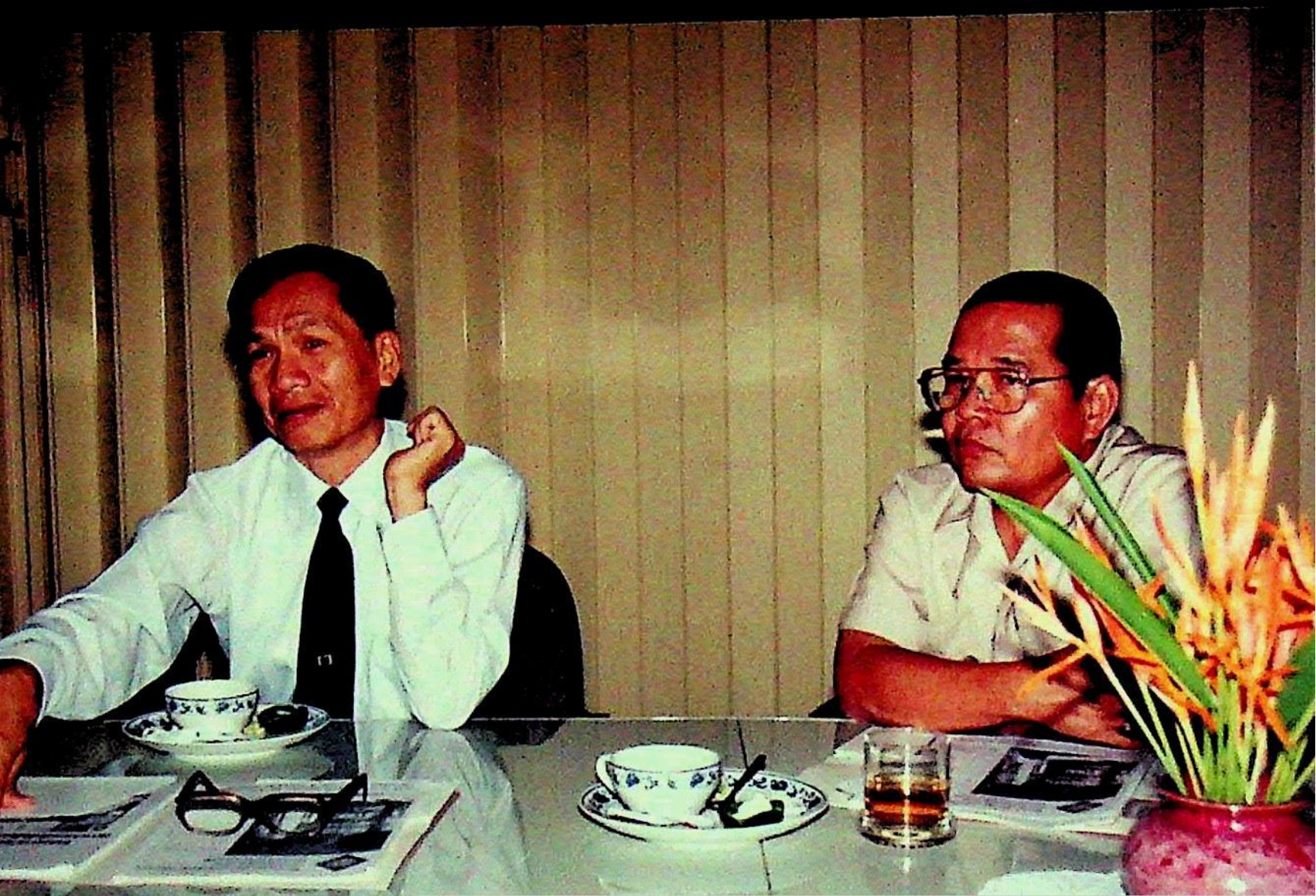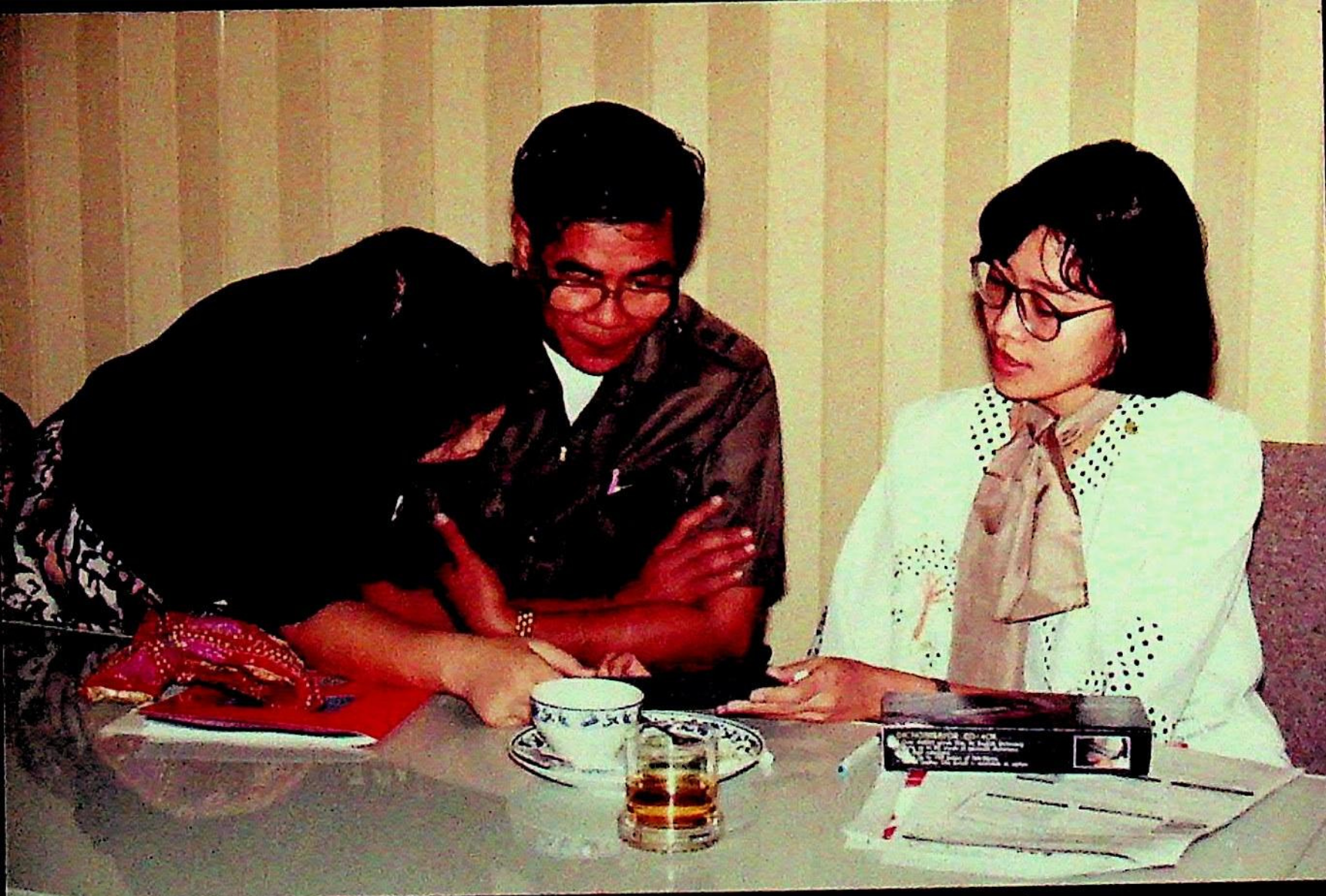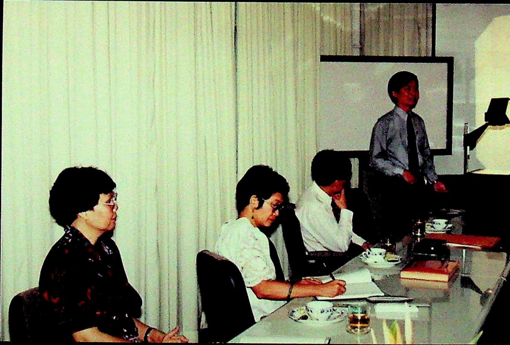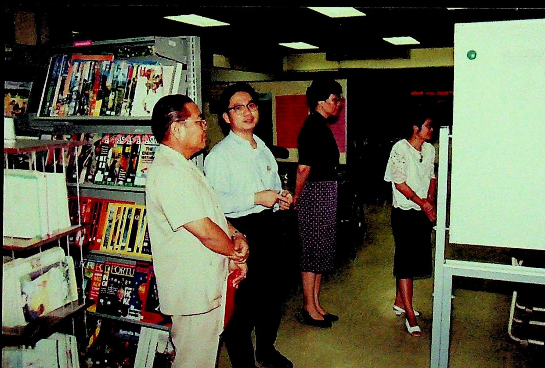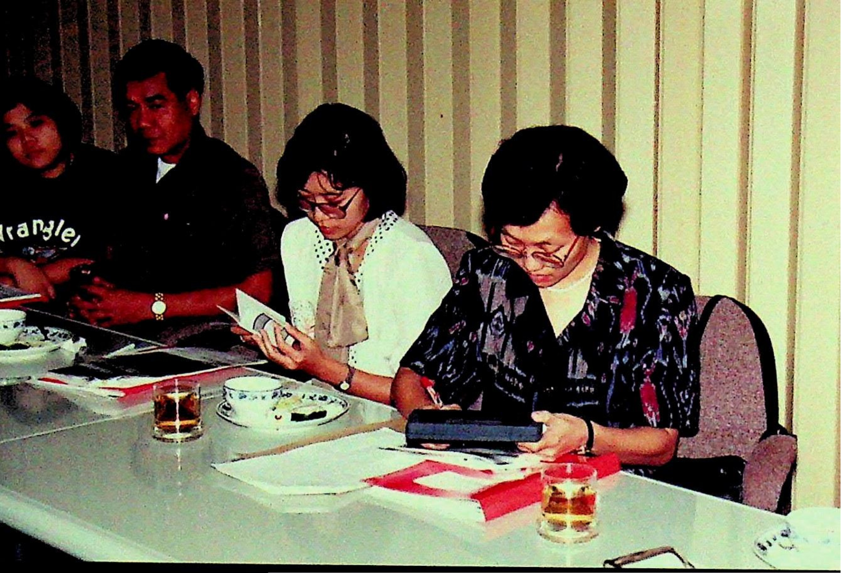 ศ.ดร.สมชาติ โสภณรณฤทธิ์ รองอธิการบดีฝ่ายวิจัยและวิเทศสัมพันธ์ และคณะ ให้การต้อนรับ พ.ต.บัญชา ไชยปาติยุทธ ผู้อำนวยการกองกลาง สำนักราชเลขาธิการ และคณะมาทดสอบการใช้งาน ดิคชันนาเรเตอร์ ก่อนนำเครื่องขึ้นทูลเกล้าถวาย พระบาทสมเด็จพระเจ้าอยู่หัว ณ ห้องประชุม สํานักคอมพิวเตอร์ ในวันพุธที่ 10 มีนาคม 2536 จากภาพถ่ายอัลบั้มที่ 3616