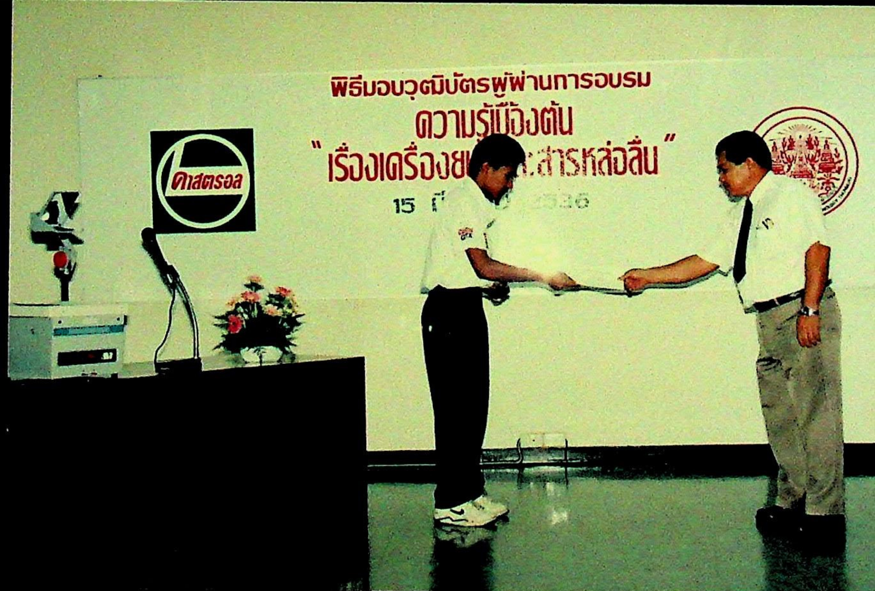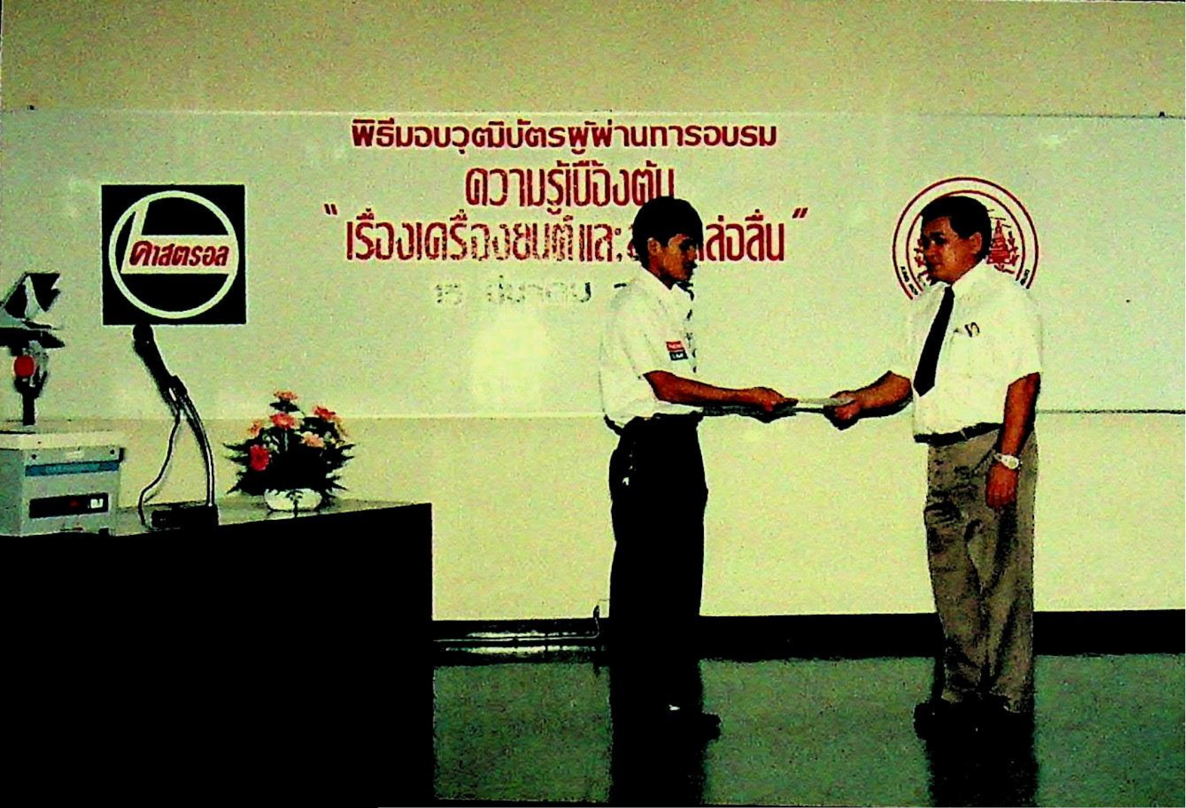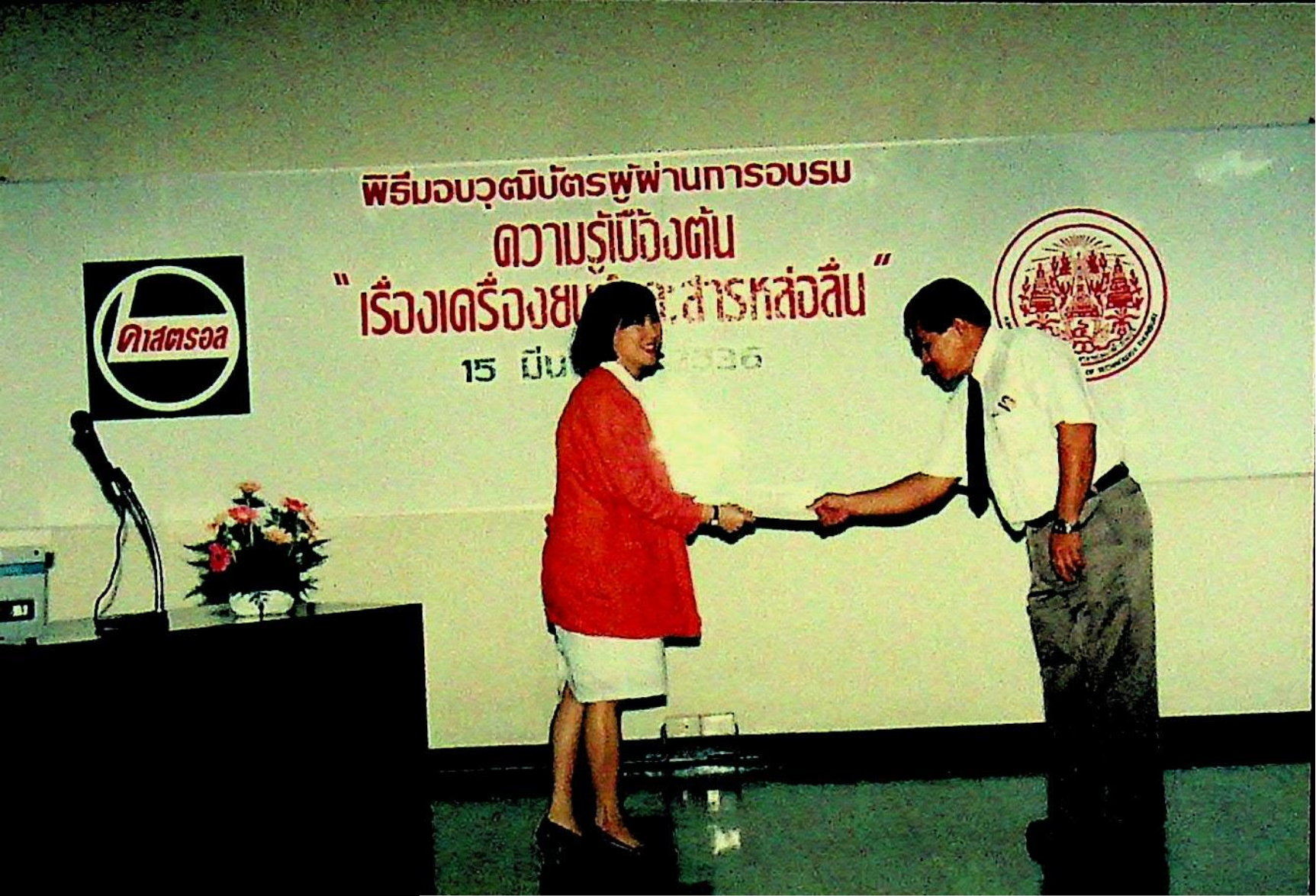 ศูนย์การศึกษาต่อเนื่อง สถาบันเทคโนโลยีพระจอมเกล้าธนบุรี จัดการอบรมการถ่ายทอดเทคโนโลยีเชิงปฏิบัติการ เรื่องพื้นฐานการบริการเครื่องยนต์ ชุดที่ 1 ครั้งที่ 3 ให้กับบริษัท คาสตรอล (ไทยแลนด์) จำกัด พร้อมทั้งแจกวุฒิบัตรแก่ผู้เข้ารับการอบรมจำนวน 31 คน ณ ห้องสัมมนา ชัน 3 อาคารสัมมนา ในวันจันทร์ที่ 15 มีนาคม 2536 จากภาพถ่ายอัลบั้มที่ 3618