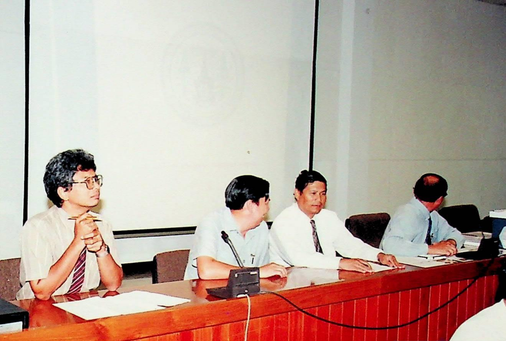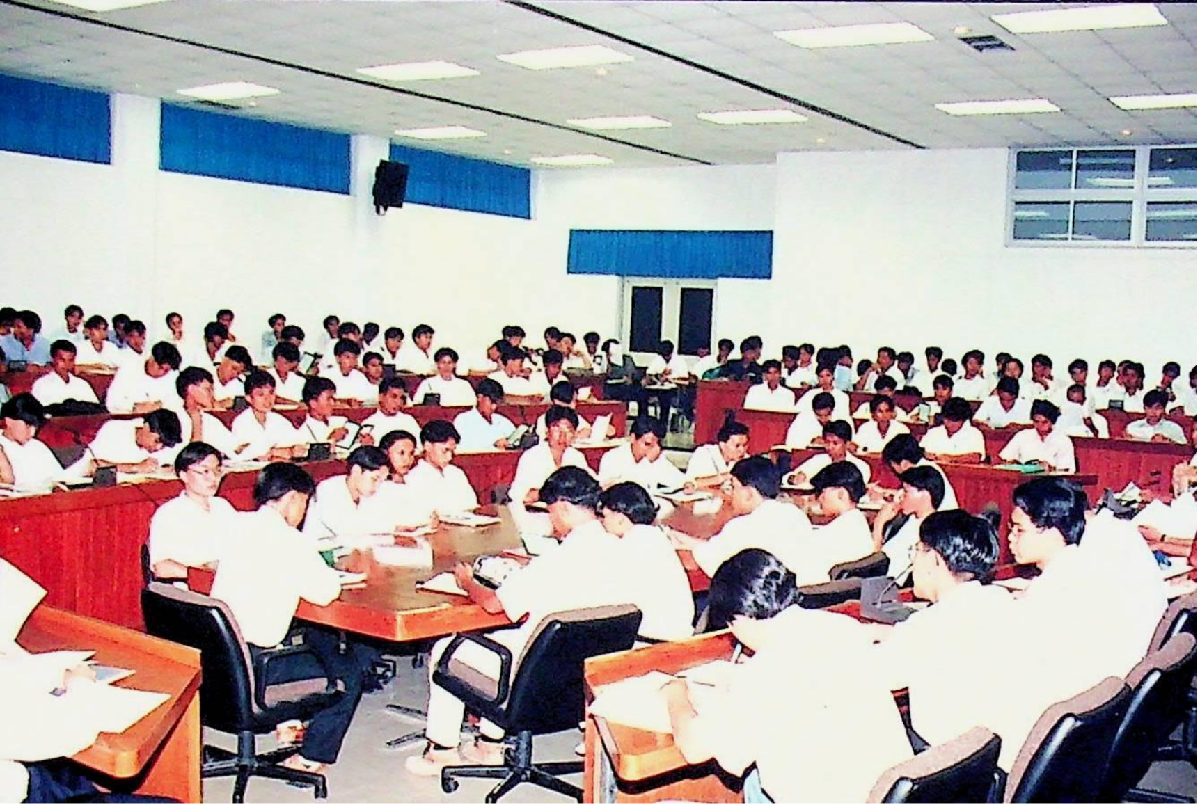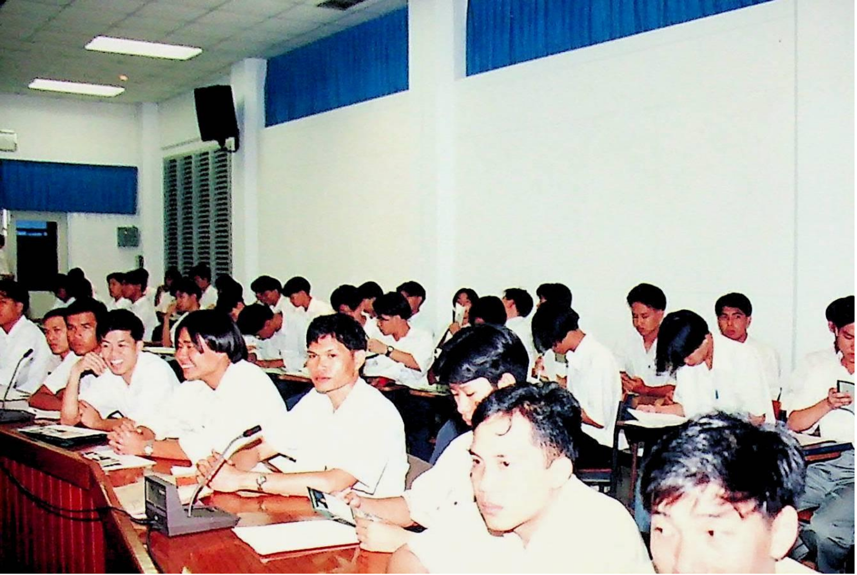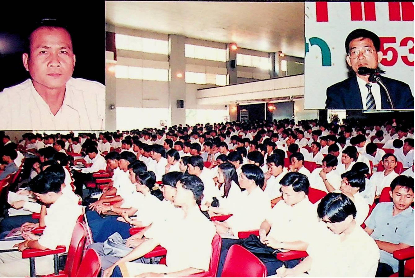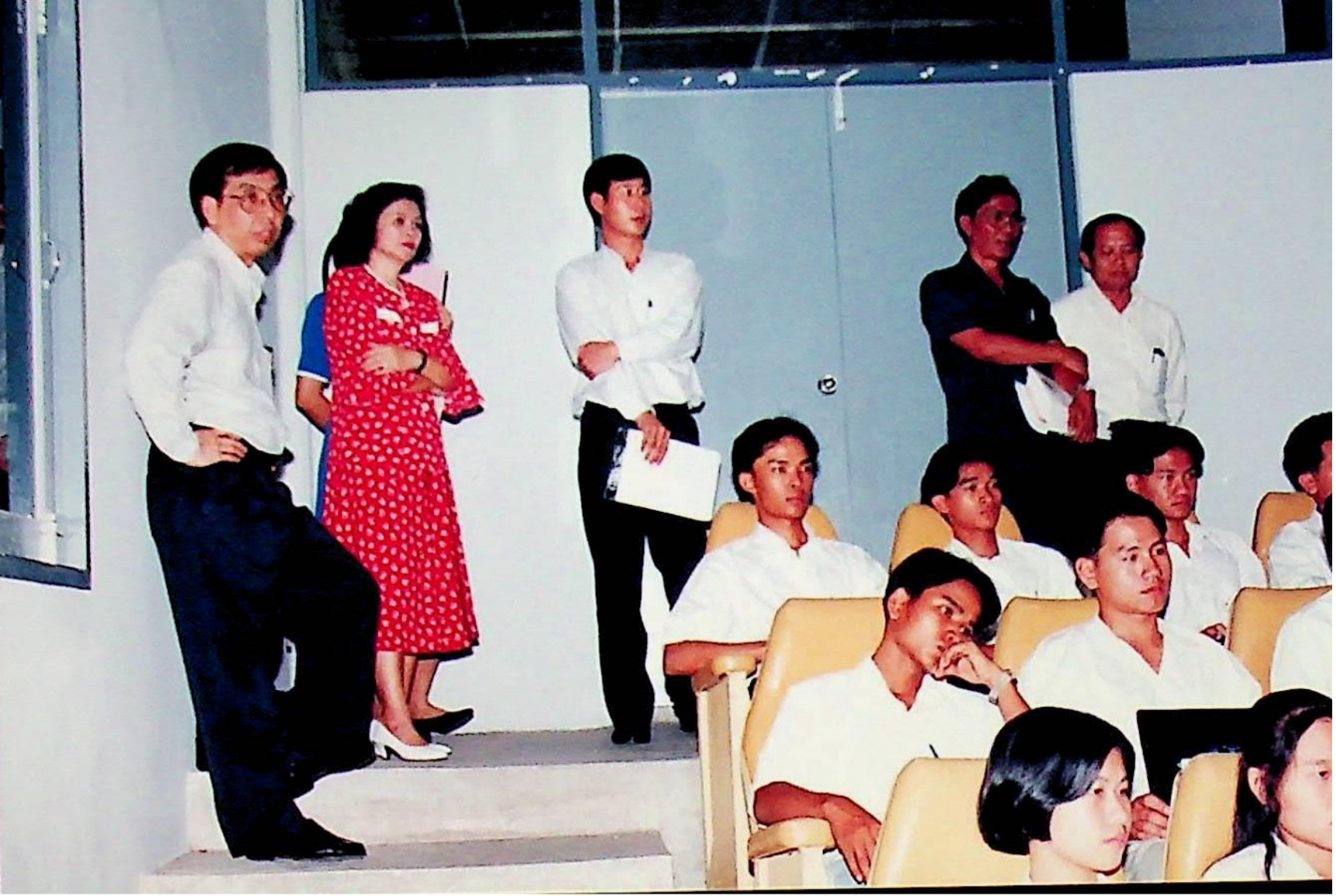 รศ.ดร.ไกรวุฒิ เกียรติโกมล รองอธิการบดีฝ่ายวิชาการ และอาจารย์วิสุทธิ ดามาพงษ์ รองอธิการบดีฝ่ายกิจการนักศึกษา ปฐมนิเทศนักศึกษาระดับ ปวส. เข้าศึกษาต่อระดับปริญญาตรีของคณะวิศวกรรมศาสตร์ และคณะครุศาสตร์อุตสาหกรรม ณ หอประชุมใหญ่,ห้องประชุมจํารัส,ห้องประชุมคณะวิทยาศาสตร์ ในวันจันทร์ที่ 18 เมษายน 2537 จากภาพถ่ายอัลบั้มที่ 3728