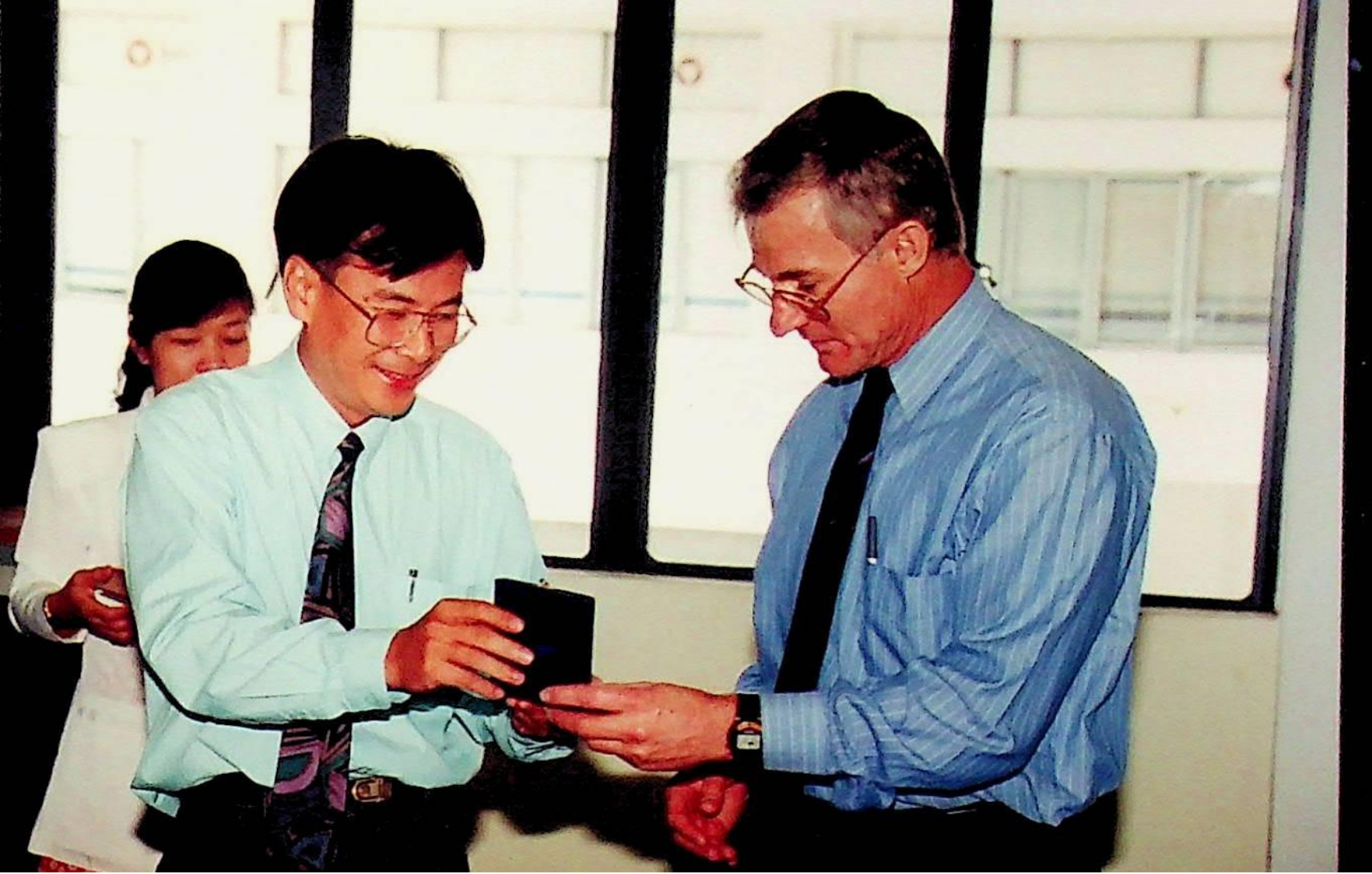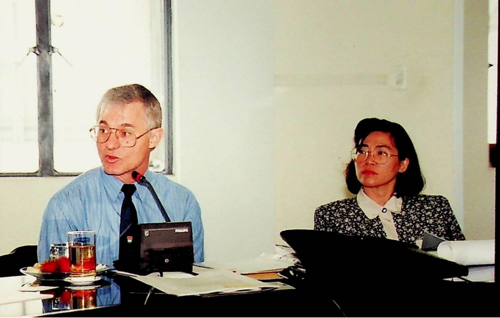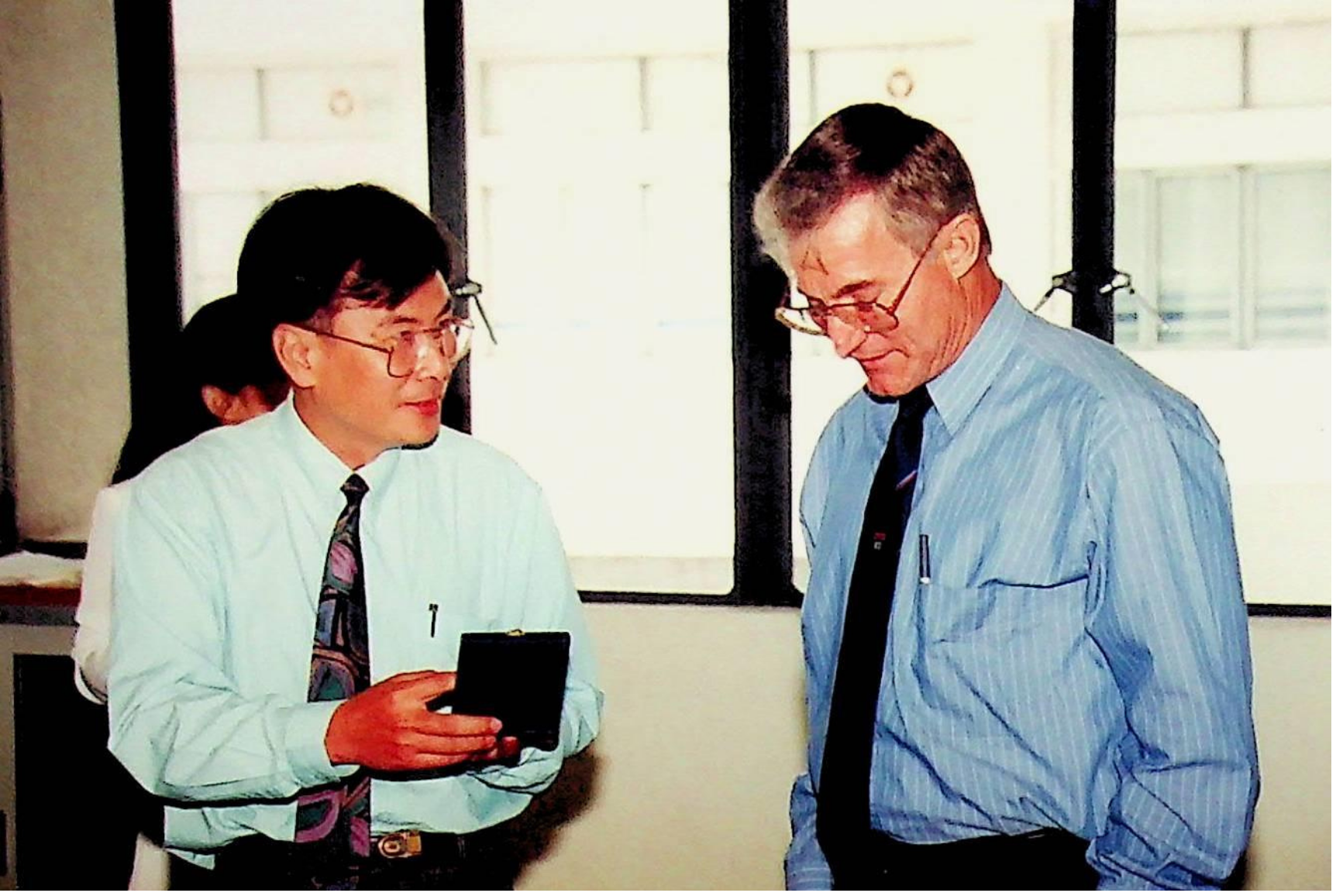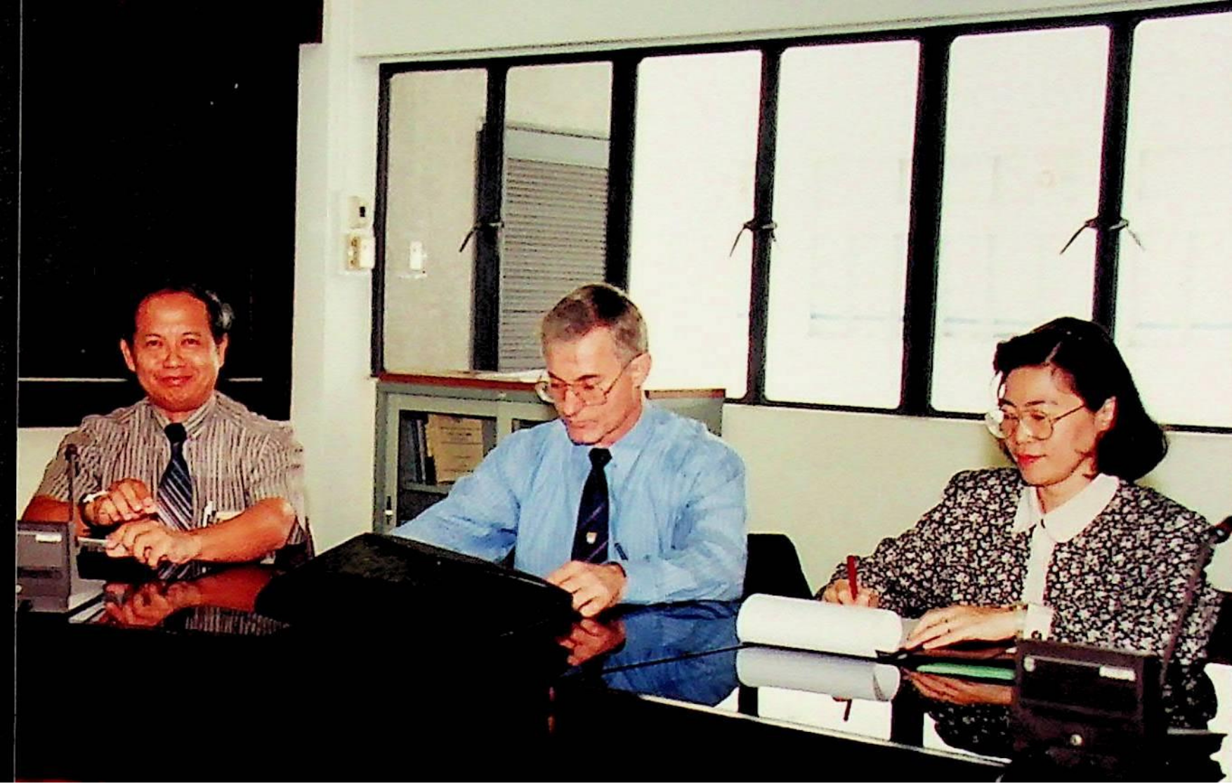 ศ.ดร.สมชาติ โสภณรณฤทธิ์ รองอธิการบดีฝ่ายวิจัยและวิเทศสัมพันธ์ และคณะ ให้การต้อนรับ Prof. W.J. Lovegrove รองอธิการบดีฝ่ายวิจัย ของมหาวิทยาลัยวูลลองกอง ประเทศออสเตรเลีย เข้าพบ เพื่อแลกเปลี่ยนความคิดเห็นทางวิชาการ และเยี่ยมชมสถาบัน ณ ห้องประชุม อาคารเรียนรวม 2 ในวันพุธที่ 1 มิถุนายน 2537 จากภาพถ่ายอัลบั้มที่ 3739
