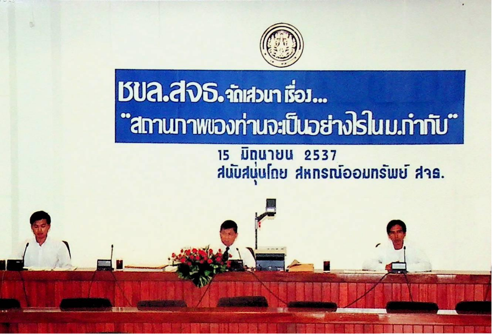 ชมรมข้าราชการสาย ค สาย ข และลูกจ้าง สถาบันเทคโนโลยีพระจอมเกล้าธนบุรี จัดเสวนาเรื่อง สถานภาพของท่านจะเป็นอย่างไรใน ม.กำกับ โดย รศ.ดร.หริส สูตะบุตร ณ ห้องประชุมจํารัส ฉายะพงศ์ ในวันพุธที่ 15 มิถุนายน 2537 จากภาพถ่ายอัลบั้มที่ 3743