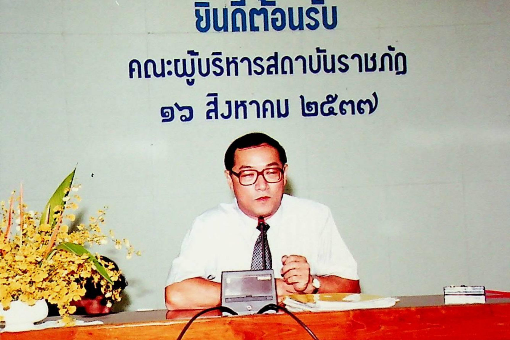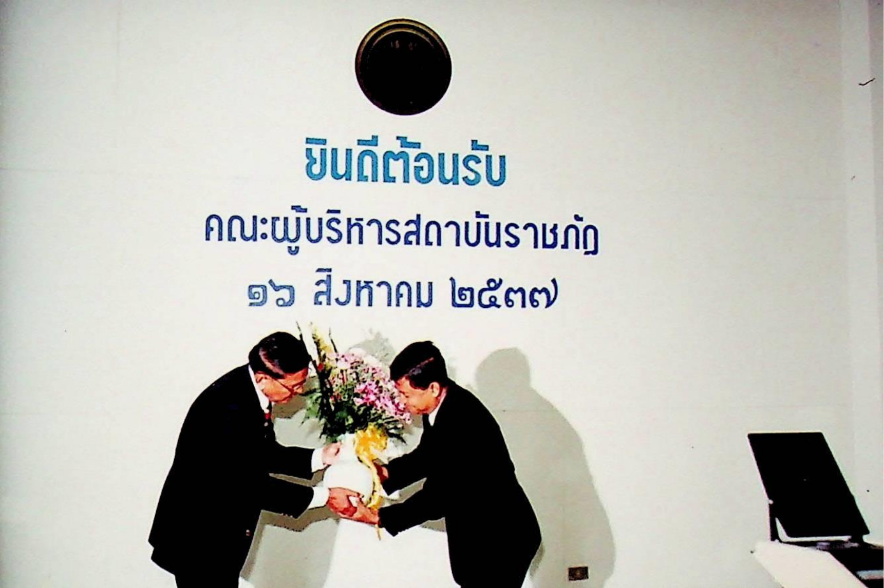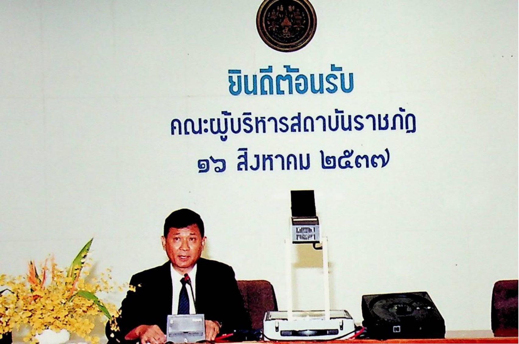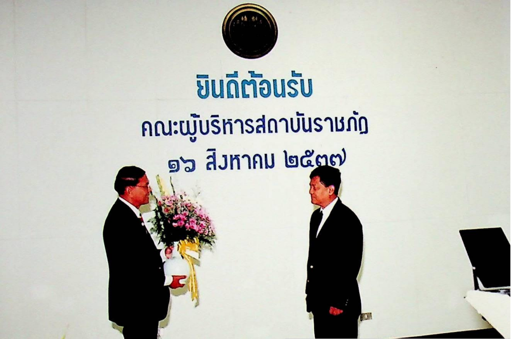รศ.ดร.หริส สูตะบุตร อธิการบดี และคณะให้การต้อนรับคณะผู้บริหารจากสถาบันราชภัฏ เข้าเยี่ยมชมสถาบัน ณ ห้องประชุมจํารัส, สํานักห้องสมุด, สํานักคอมพิวเตอร์ ในวันอังคารที่ 16 สิงหาคม 2537 จากภาพถ่ายอัลบั้มที่ 3753