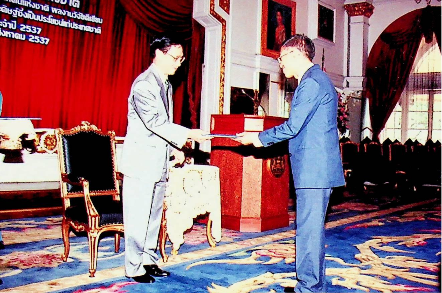 รศ.ดร.พิเชษฐ ลิมสุวรรณ และคณะ เข้ารับรางวัลชมเชย ผลงานคิดค้น หรือสิ่งประดิษฐ์ซึ่งเป็นประโยชน์ต่อประเทศชาติ ประจำปี 2537 เรื่อง การสร้างและพัฒนาเตาไฟฟ้าอุณหภูมิสูง สำหรับใช้ในการเผาพลอย จาก พณฯ ชวน หลีกภัย นายกรัฐมนตรี ณ ตึกสันติไมตรี ทําเนียบรัฐบาล ในวันพุธที่ 17 สิงหาคม 2537 จากภาพถ่ายอัลบั้มที่ 3754 และ 3755
