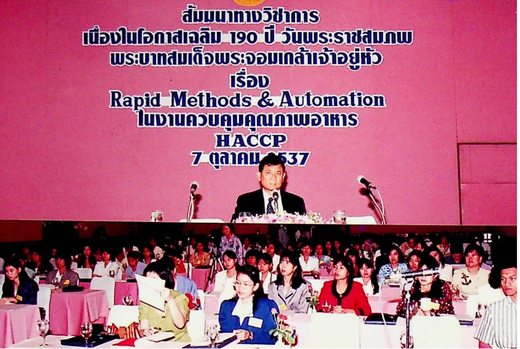 รศ.ดร.หริส สูตะบุตร อธิการบดี เป็นประธานเปิดการสัมมนาทางวิชาการ เนื่องในโอกาส 190 ปีแห่งวันพระราชสมภพ พระบาทสมเด็จพระจอมเกล้าเจ้าอยู่หัว เรื่อง Rapid Methods & Automation ในงานควบคุมคุณภาพอาหาร HACCP จัดโดยภาควิชาจุลชีววิทยา และศูนย์การศึกษาต่อเนื่อง ณ โรงแรม สยามซิตี้ ในวันศุกร์ที่ 7 ตุลาคม 2537 จากภาพถ่ายอัลบั้มที่ 3765
