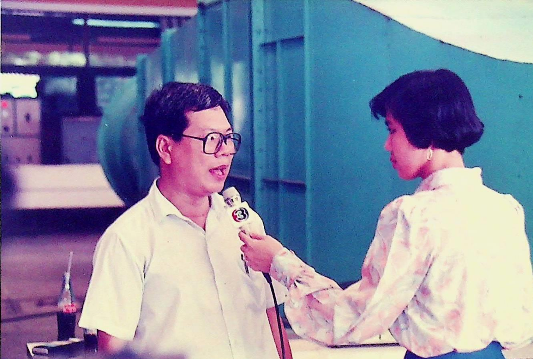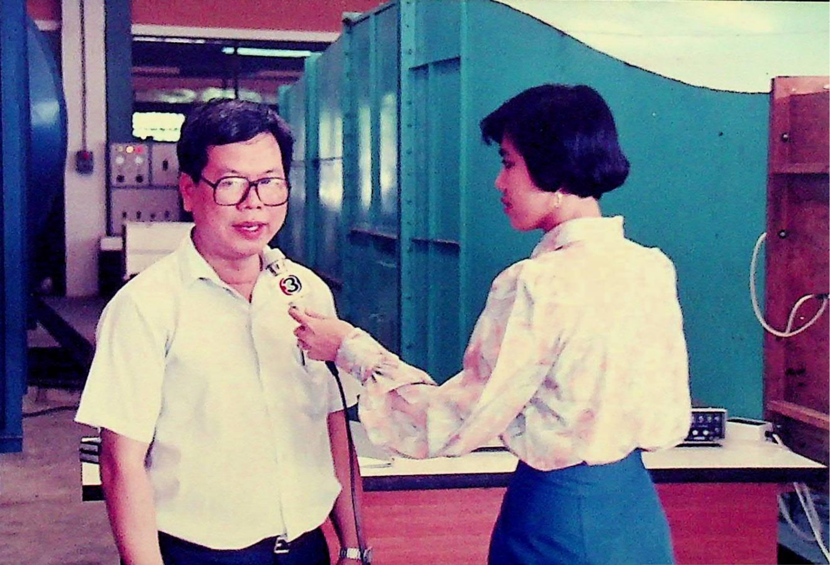 คุณสนมพร ฉิมเฉลิม จากรายการ สมองไทย สถานีโทรทัศน์ไทยทีวีสี ช่อง 3 ทำข่าวการทดสอบหลักพลศาสตร์ (อุโมงค์ลม) โดยมีอาจารย์บันเทิง สุวรรณตระกูล ให้รายละเอียด ณ อาคารเครื่องกล 2 ในวันที่ 25 กรกฏาคม 2532 จากภาพถ่ายอัลบั้มที่ 3228