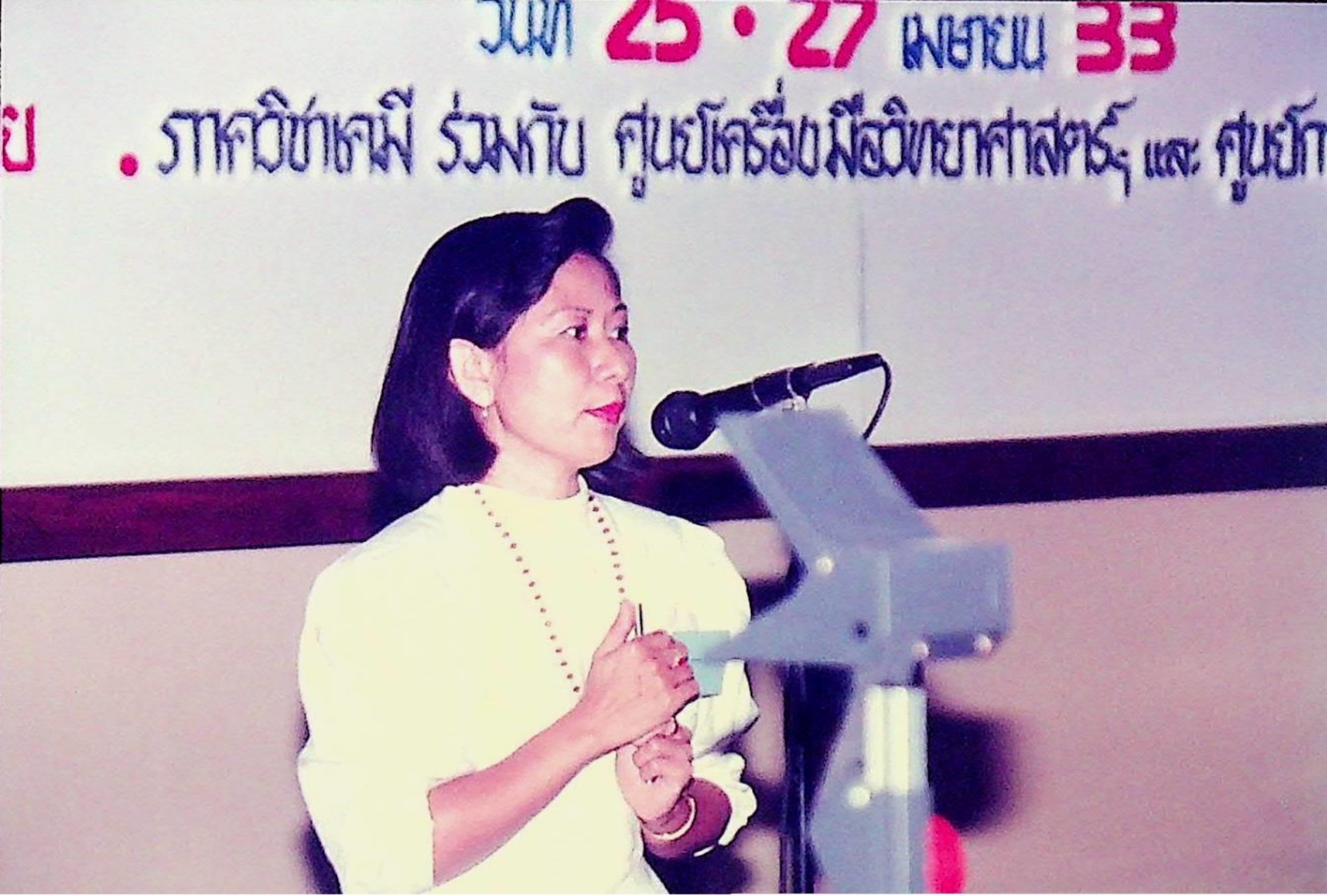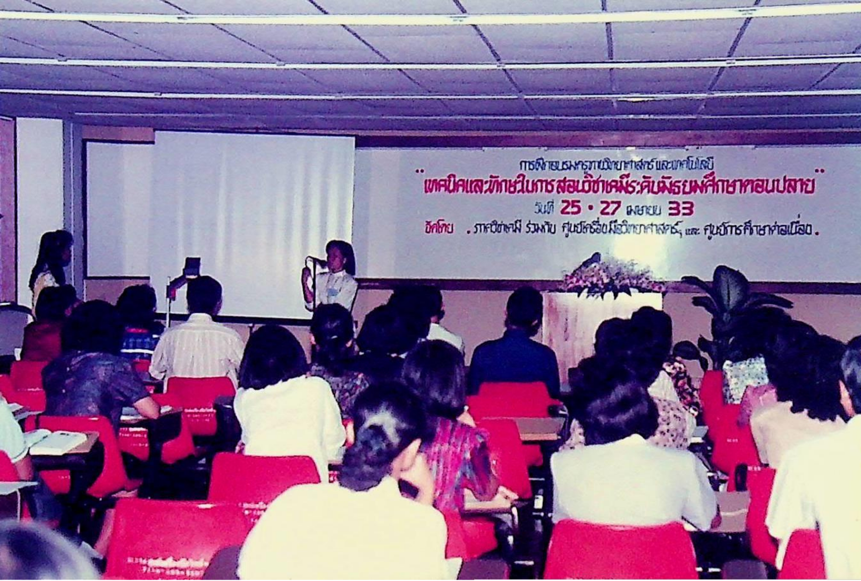 อธิการบดี เป็นประธานเปิดการอบรมเรื่อง เทคนิคและทักษะในการสอนวิชาเคมีระดับมัธยมศึกษาตอนปลาย โดยมีอาจารย์ผู้สอนวิชาเคมีจากโรงเรียนต่าง ๆ ในส่วนกลาง จำนวน 38 โรงเรียน เข้ารับการอบรม จัดโดยภาควิชาเคมี ร่วมกับศูนย์การศึกษาต่อเนื่อง และศูนย์เครื่องมือวิทยาศาสตร์ฯ ณ ศูนย์เครืองมือวิทยาศาสตร์ฯ ในวันที 25 เมษายน 2533 จากภาพถ่ายอัลบั้มที่ 3324