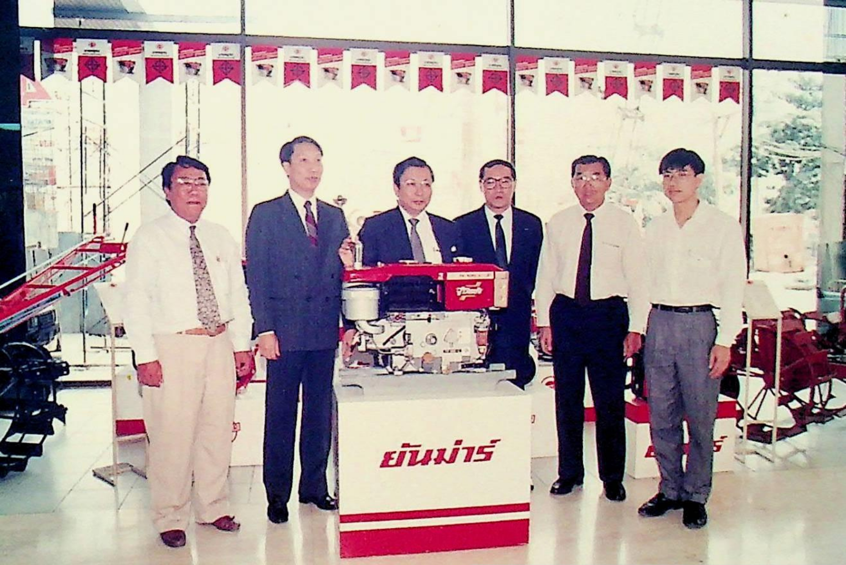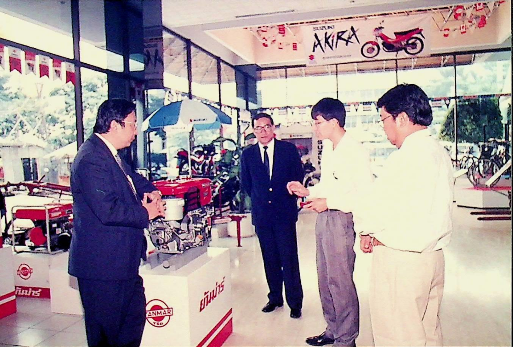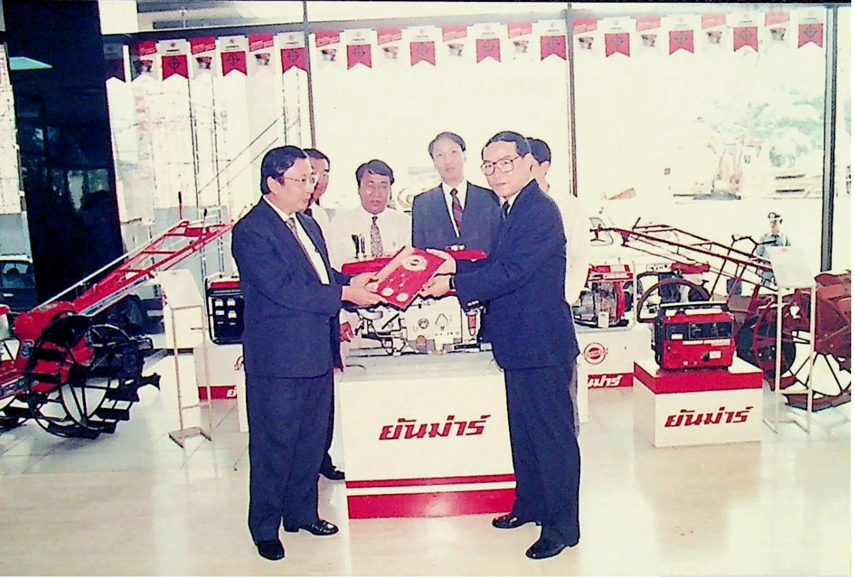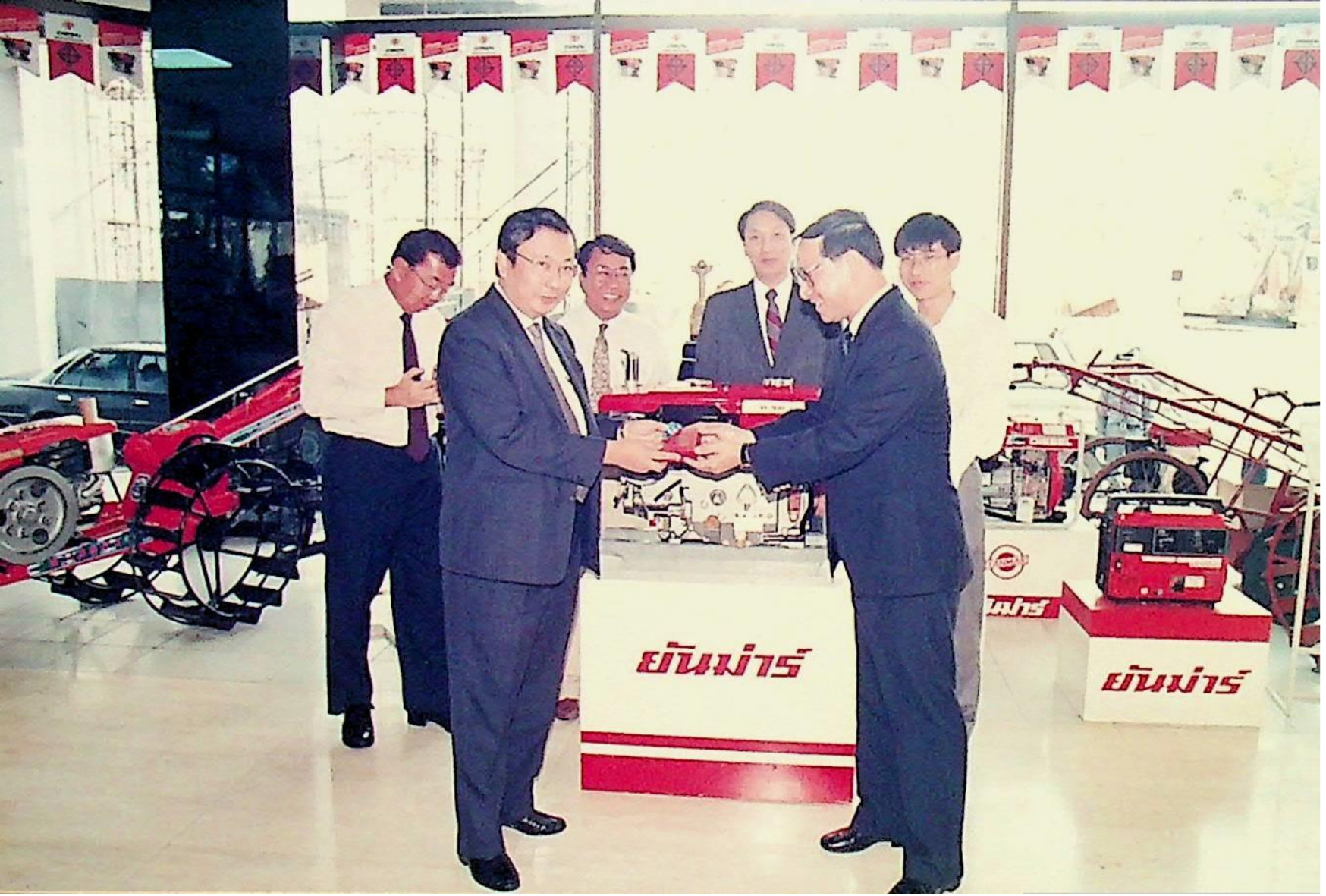 รองอธิการบดีฝ่ายวิจัยและวิเทศสัมพันธ์ รับมอบเครื่องยนต์ยันม่าร์จาก ดร.ชุมพล พรประภา ประธานกรรมการบริษัท ยันม่าร์ เอส.พี.ไอ. จำกัด ซึ่งมอบให้แก่ภาควิชาวิศวกรรมไฟฟ้า เพื่อใช้ประโยชน์ในการศึกษา ณ อาคาร SPI. หัวหมาก ในวันที่ 19 พฤศจิกายน 2533 จากภาพถ่ายอัลบั้มที่ 3366