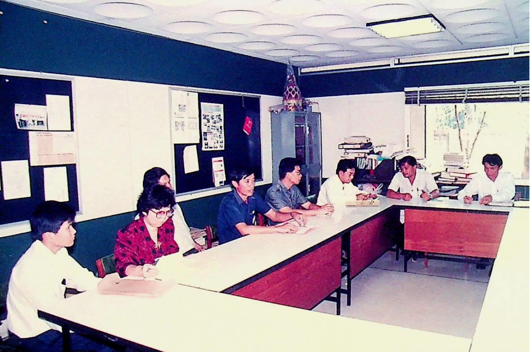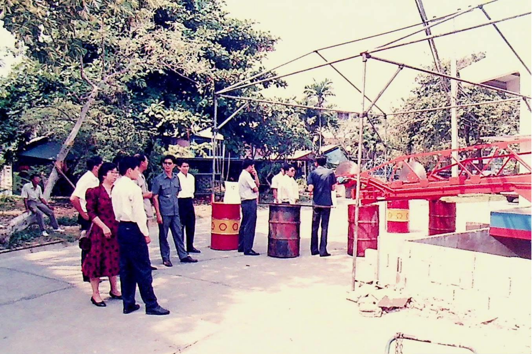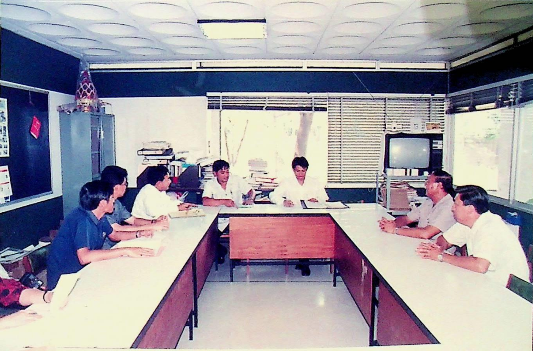 คณะกรรมการตรวจการจ้าง กรมเจ้าท่า มาตรวจการสร้างเรือกำจัดผักตบชวา เจ้าท่า ผ. ที่กรมเจ้าท่าจ้างภาควิชาวิศวกรรมเครื่องกลสร้าง ณ ภาควิชาวิศวกรรมเครืองกล ในวันอังคารที 14 เมษายน 2535 จากภาพถ่ายอัลบั้มที่ 3516