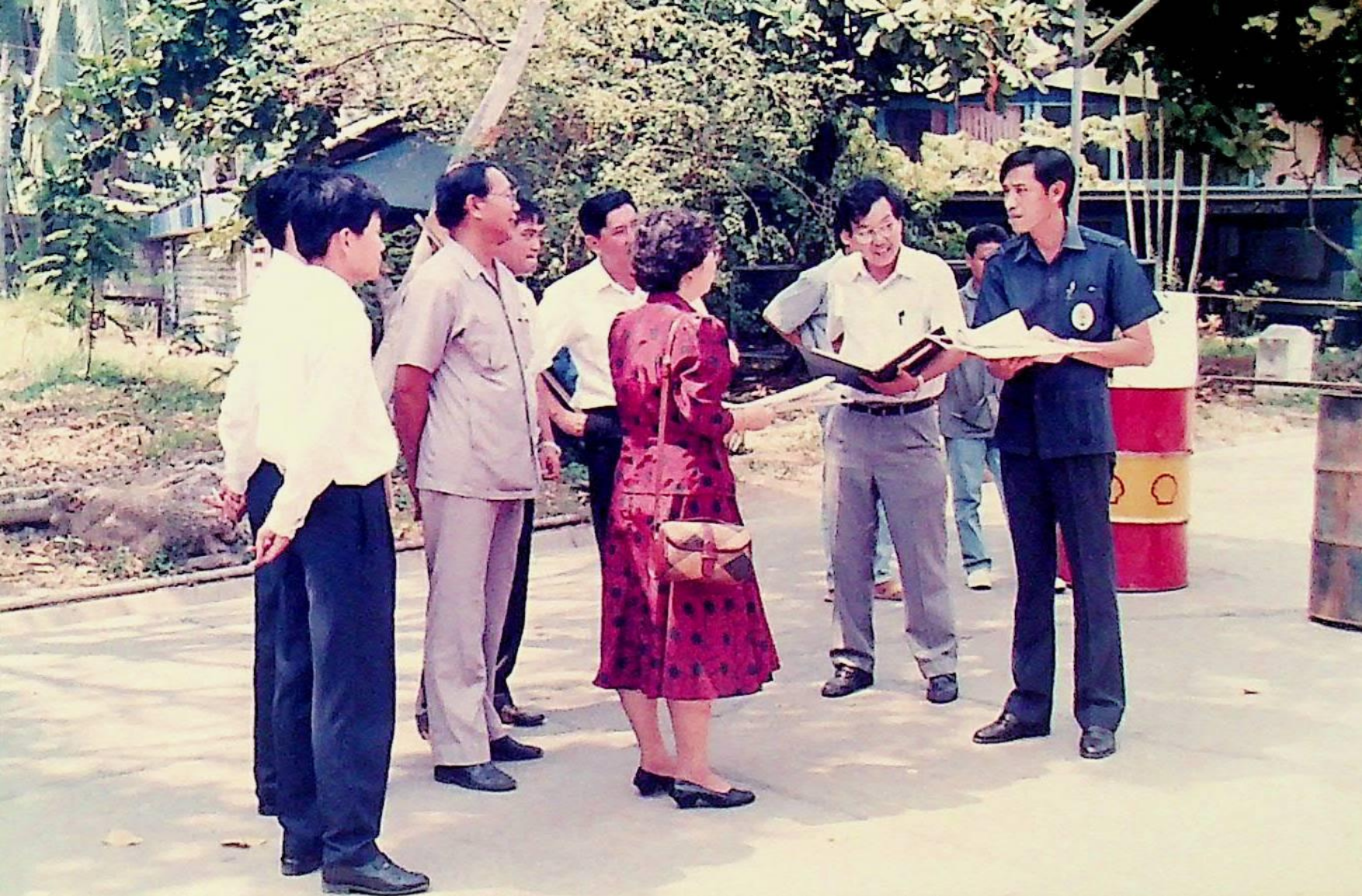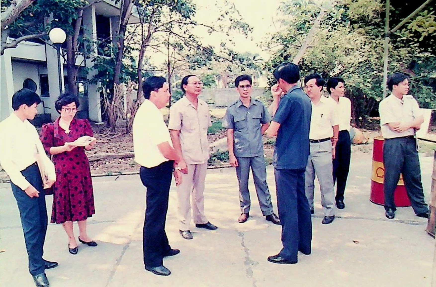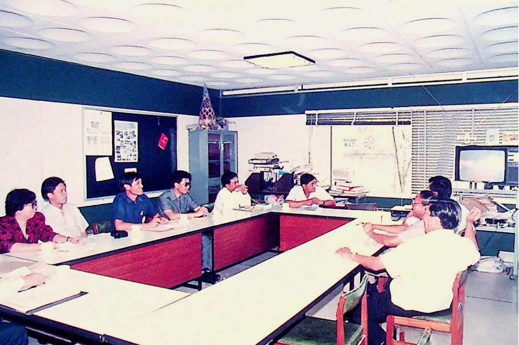 คณะกรรมการตรวจการจ้าง กรมเจ้าท่า มาตรวจการสร้างเรือกำจัดผักตบชวา เจ้าท่า ผ. ที่กรมเจ้าท่าจ้างภาควิชาวิศวกรรมเครื่องกลสร้าง ณ ภาควิชาวิศวกรรมเครืองกล ในวันอังคารที 14 เมษายน 2535 จากภาพถ่ายอัลบั้มที่ 3516