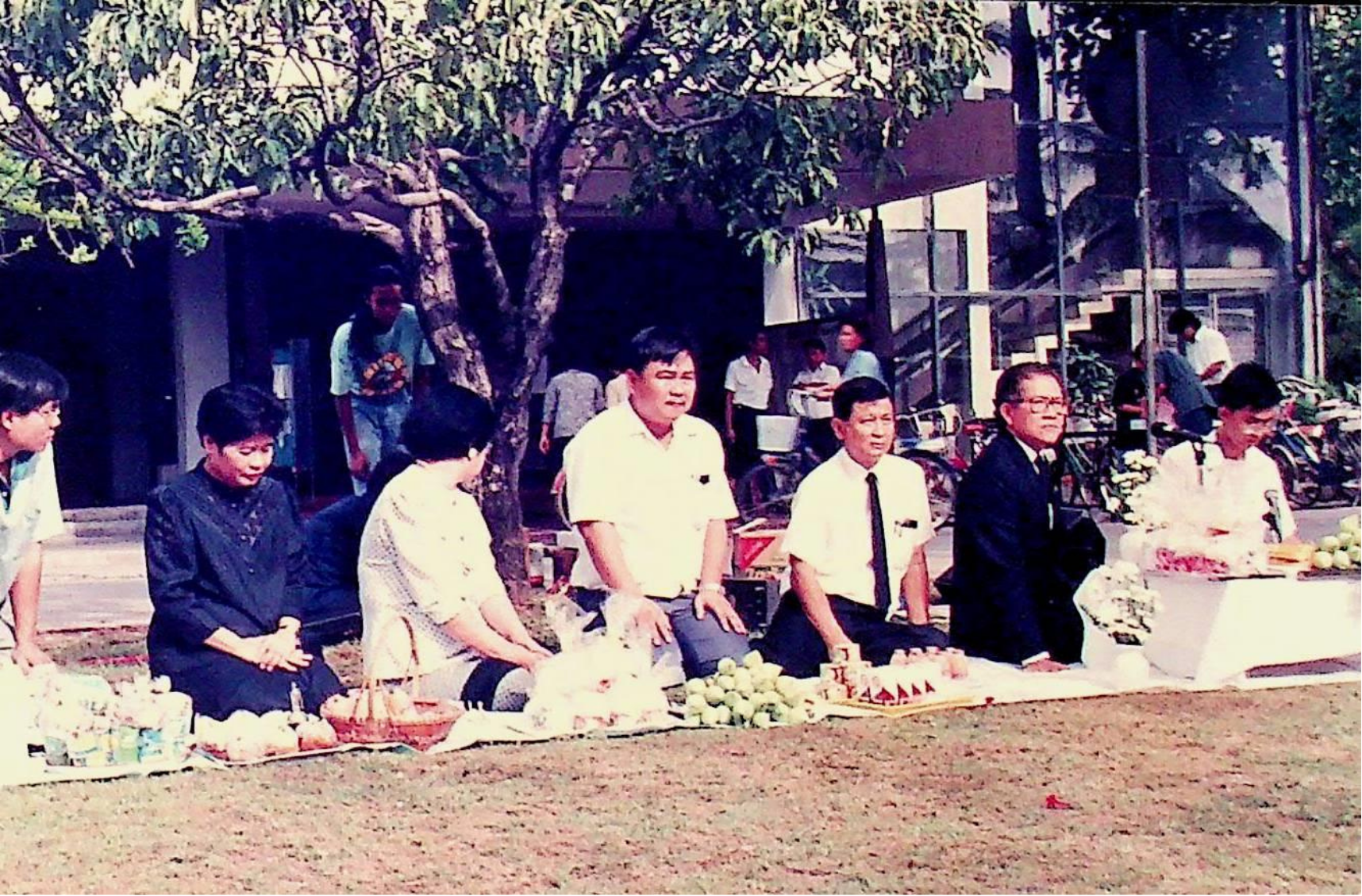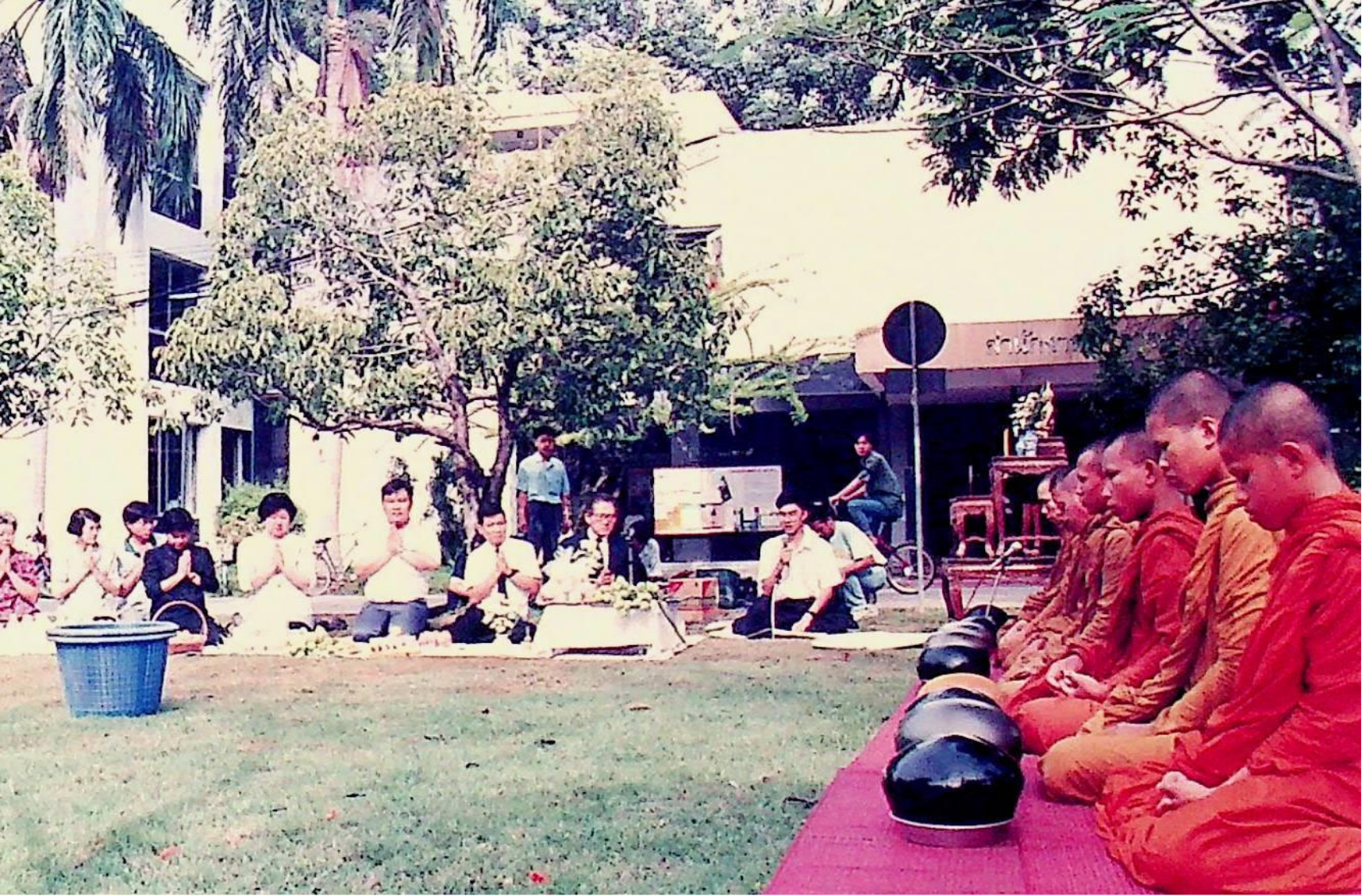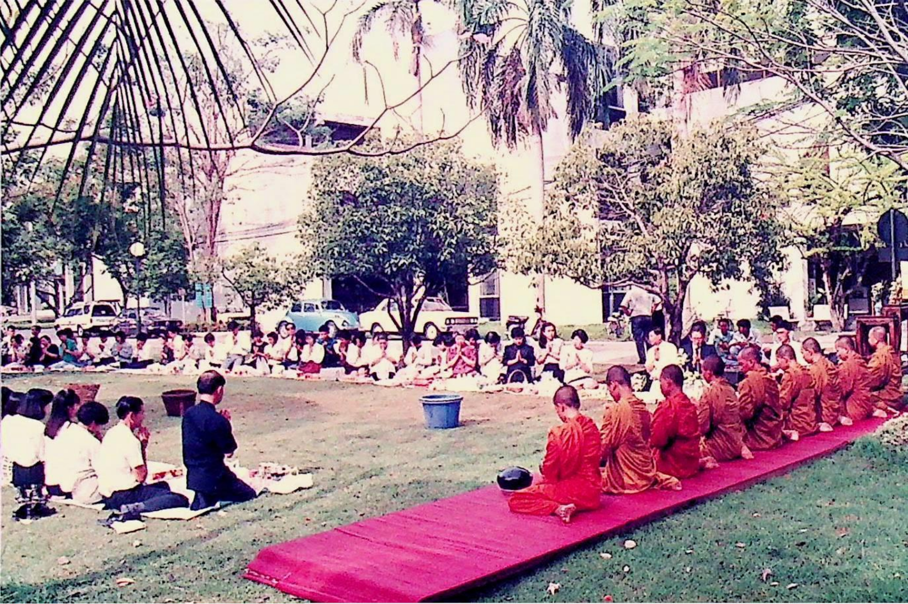 อธิการบดีนำอาจารย์ ข้าราชการ และนักศึกษาของสถาบัน ทำบุญเพื่ออุทิศส่วนกุศลแด่ ผู้เสียชีวิตในเหตุการณ์ชุมนุมเรียกร้องประชาธิปไตย ให้นายกรัฐมนตรีมาจากการเลือกตั้ง ณ หน้าอาคาร สนอ. ในจันทร์ที่ 25 พฤษภาคม 2535 จากภาพถ่ายอัลบั้มที่ 3518