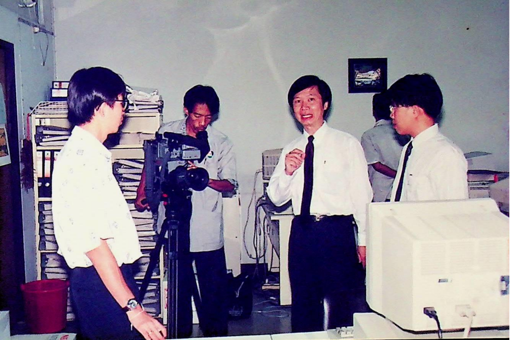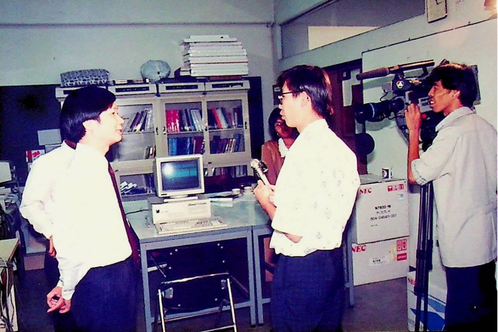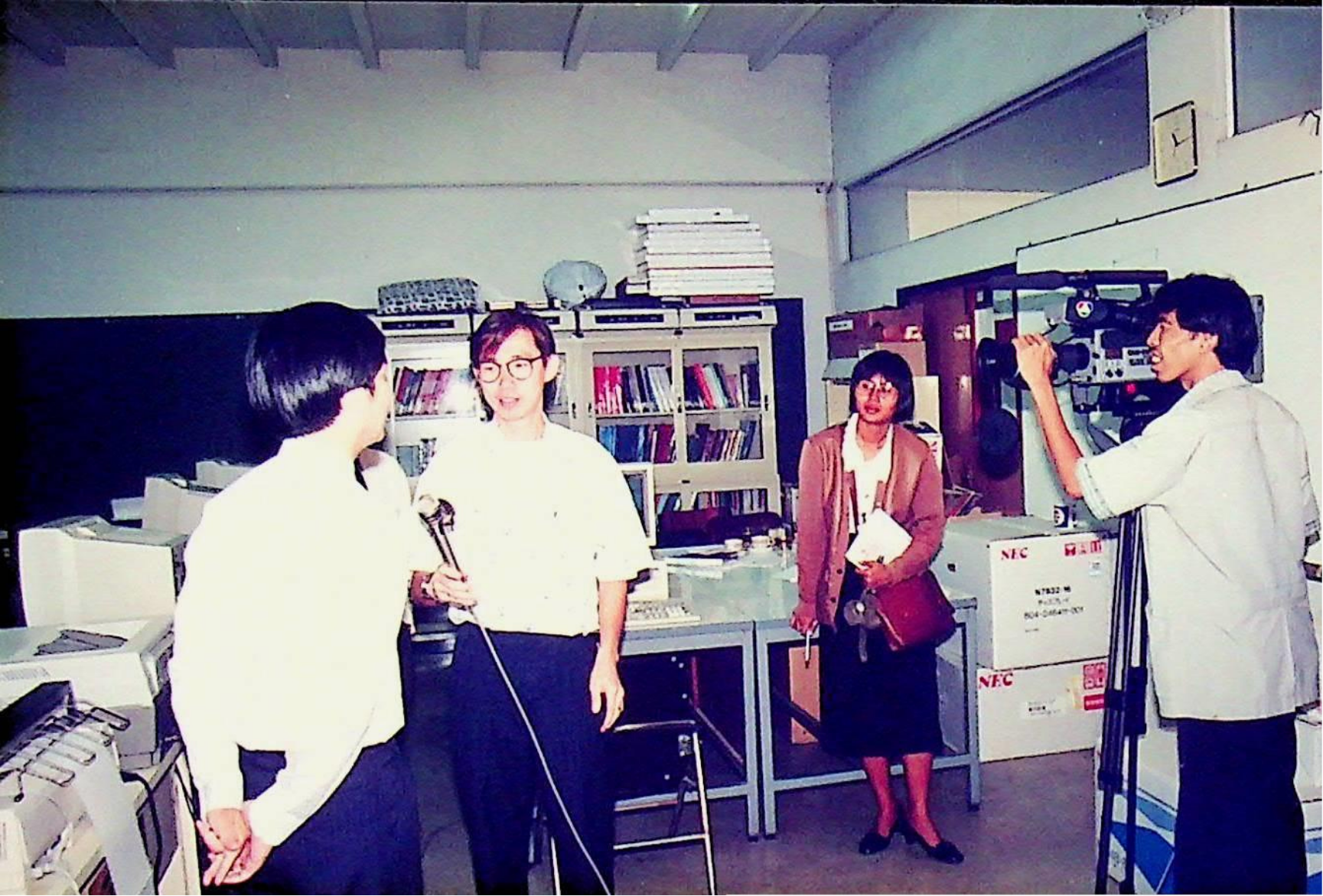 ผู้สื่อข่าวสถานีโทรทัศน์สีกองทัพบก ช่อง 7 ทำข่าว ปัญญาประดิษฐ์ ระบบผู้เชี่ยวชาญ โดยสัมภาษณ์ อาจารย์บุญเจริญ ศิริเนาวกุล เพื่อนำไปแพร่ภาพในรายการ คนไทยวันนี้ ณ ศูนย์วิจัยปัญญาประดิษฐ์ ในวันอังคารที่ 17 พฤศจิกายน 2535 จากภาพถ่ายอัลบั้มที่ 3563