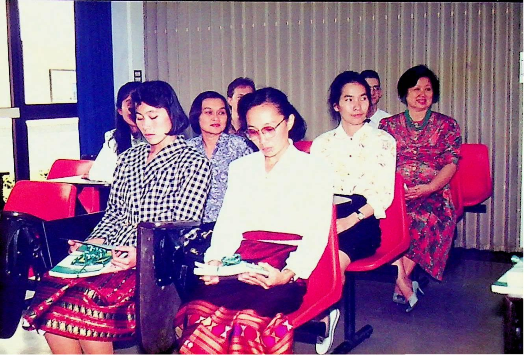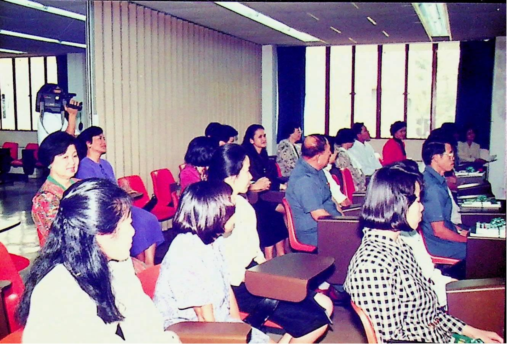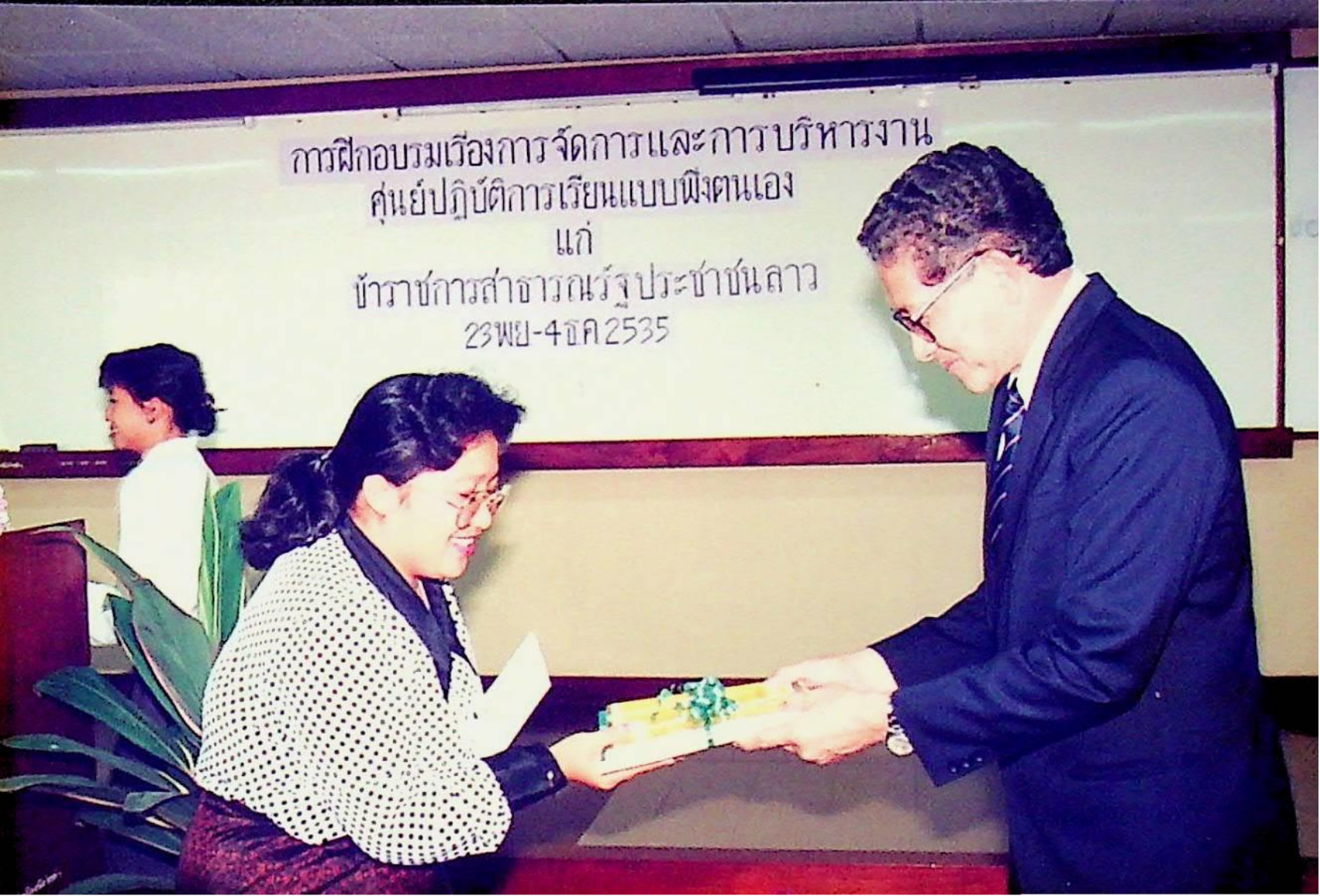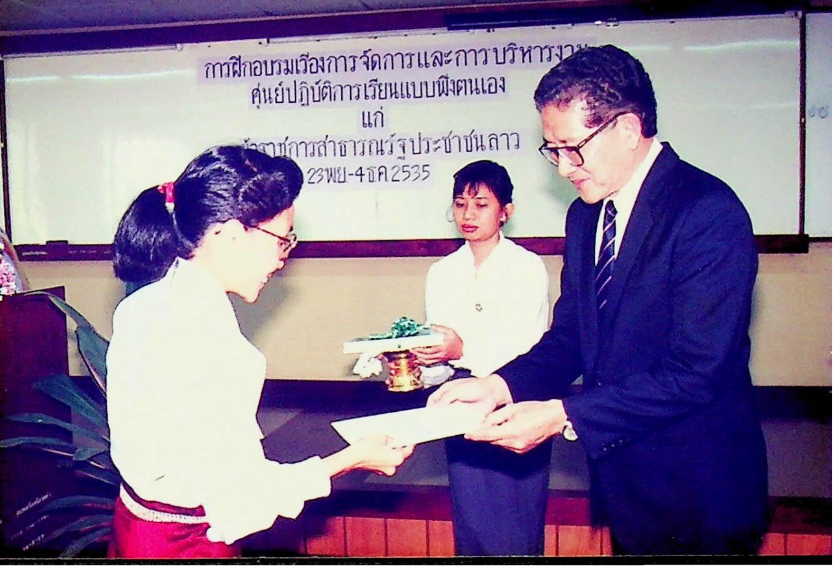 รศ.ดร.ไพบูลย์ หังสพฤกษ์ ที่ปรึกษาสถาบัน เป็นประธานพิธีปิดการฝึกอบรม และแจกวุฒิบัตรแก่ผู้ผ่านการฝึกอบรมการบริหารงานศูนย์ปฏิบัติการเรียนแบบพึ่งตนเอง ข้าราชการจากกรมป่าไม้ ประเทศสาธารณรัฐประชาชนลาว ณ ห้อง อาคารศูนย์เครืองมือวิทยาศาสตร์ฯ ในวันศุกร์ที่ 4 ธันวาคม 2535 จากภาพถ่ายอัลบั้มที่ 3570-3571
