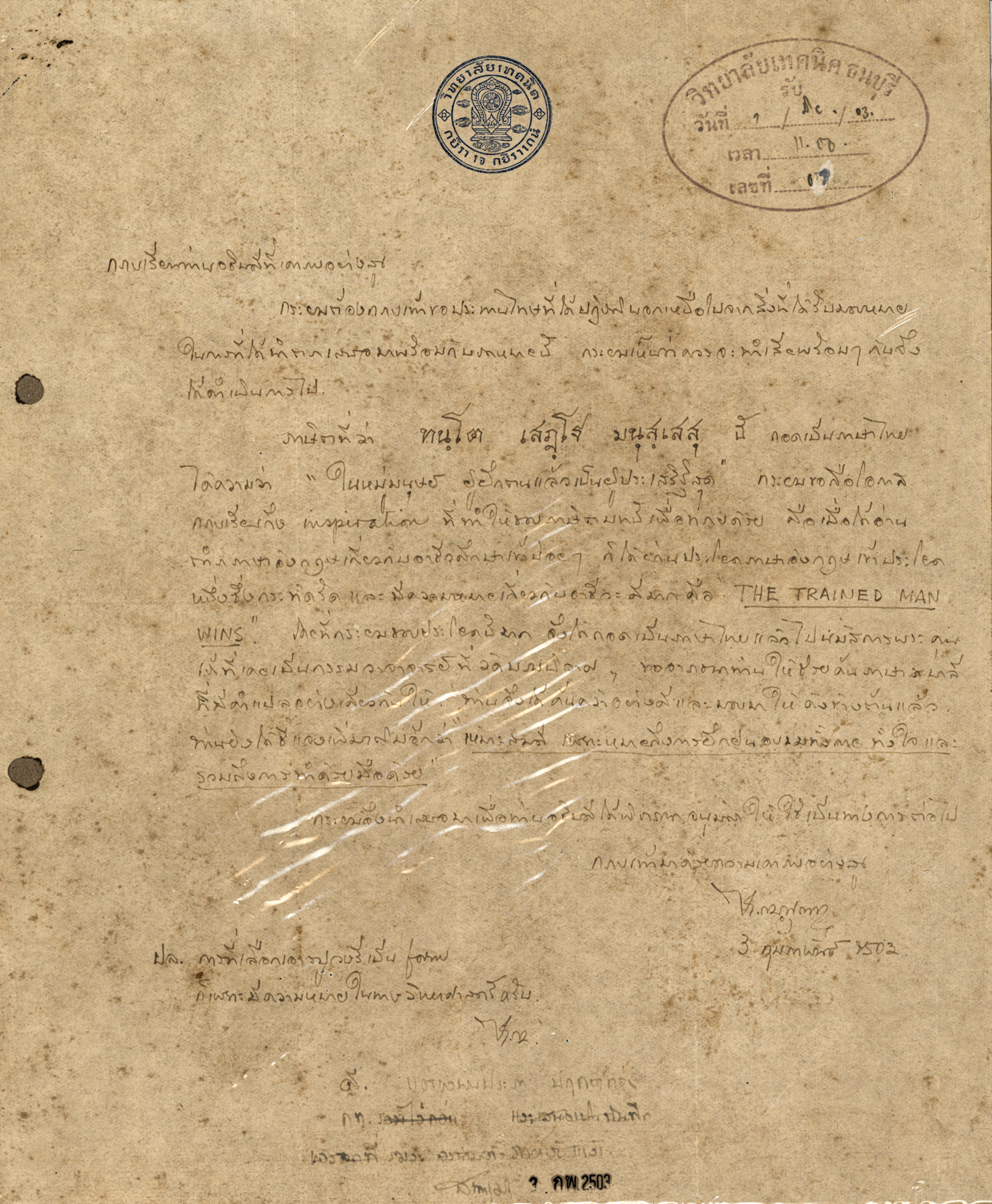 จดหมายอาจารย์ประภา ประจักษ์ศุภนิติ ถึงท่านอธิบดีถึงท่านอธิบดีสนั่น สุมิตร ลงวันที่ 3 กุมภาพันธ์ 2503 ความส่วนหนึ่งว่า "ภาษิตที่ว่า ทนฺโต เสฎฺโฐ มนุสฺเสสุ นี้ ถอดเป็นภาษาไทยได้ความว่า “ในหมู่มนุษย์ ผู้ฝึกตนแล้วเป็นผู้ประเสริฐสุด” กระผมขอถือโอกาสกราบเรียนถึง Inspiration ที่ทำให้ชอบภาษิตบทนี้เพื่อทราบด้วย คือ เมื่อได้อ่านคำภาษาอังกฤษเกี่ยวกับอาชีวศึกษาเข้าบ่อย ๆ ก็ได้ผ่านประโยคภาษาอังกฤษเข้าประโยคหนึ่งซึ่งกะทัดรัด และมีความเหมายเกี่ยวกับอาชีวะดีมากคือ “THE TRANIED MAN WINS” โดยที่กระผมชอบประโยคนี้มาก จึงได้ถอดเป็นภาษาไทยแล้วไปนมัสการพระคุณเจ้าที่เคยเป็นกรรมวาจาจารย์ที่วัดบรมนิวาสฯ ขออาราธนาท่านให้ช่วยค้นภาษาบาลีที่มีคำแปลอย่างเดียวกันให้ ท่านจึงได้ค้นคว้าอย่างดีและมอบมาให้ดังข้างต้นแล้ว ท่านยังได้ชี้แจงเพิ่มเติมอีกว่า “เหมาะสมดี เพราะหมายถึงการฝึกฝนอบรมทั้งกาย ทั้งใจ และรวมถึงการทำด้วยมือด้วย”