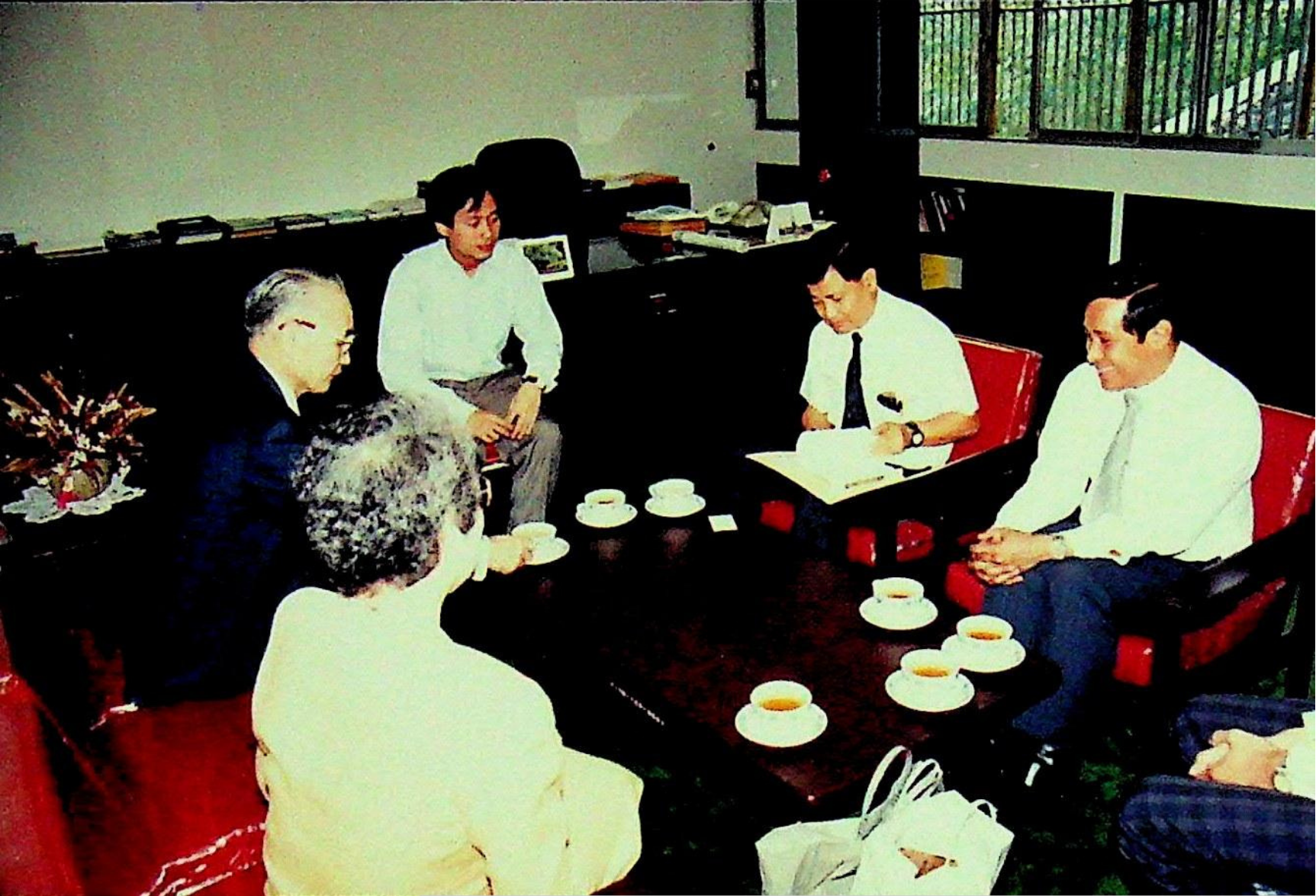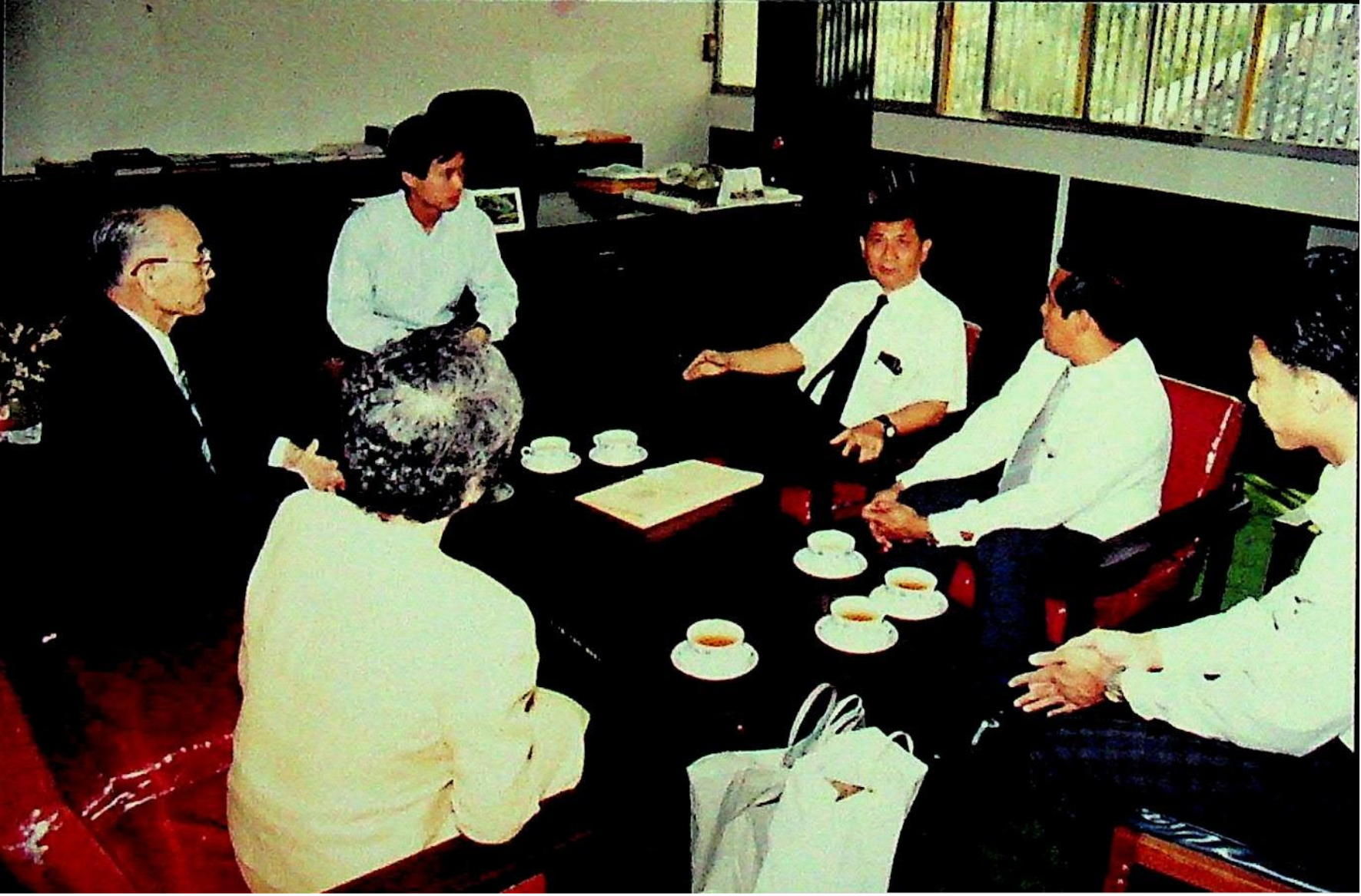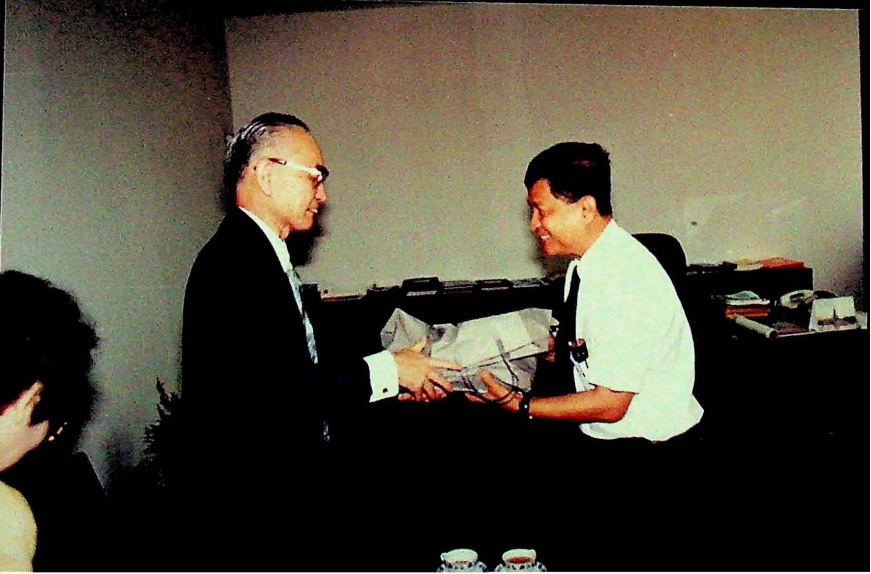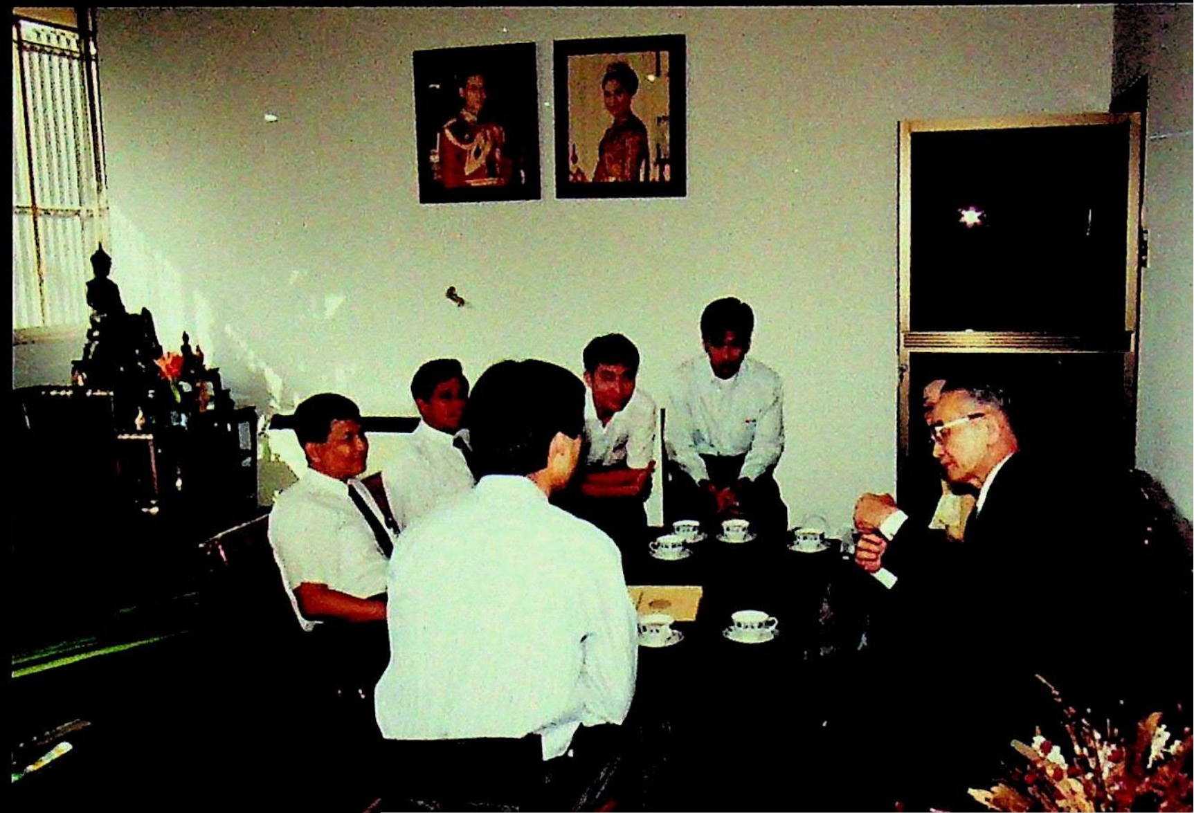 ศาสตราจารย์ ดร.ทัตสึยะ ฮาราดะ จากสถาบันเทคโนโลยีนิปปอน ประเทศญี่ปุ่น เข้าพบ รศ.ดร.หริส สูตะบุตร อธิการบดี เพื่อแลกเปลี่ยนความคิดเห็น และเยี่ยมชมคณะวิศวกรรมศาสตร์ ณ ห้องอธิการบดี ในวันพุธที่ 27 มกราคม 2536 จากภาพถ่ายอัลบั้มที่ 366
