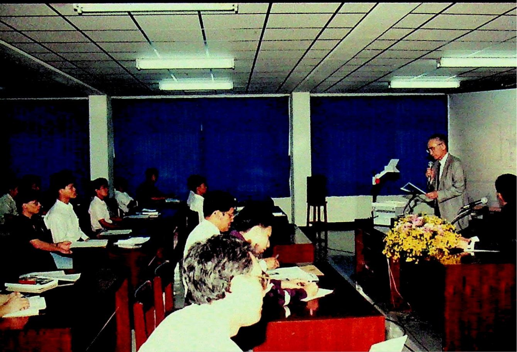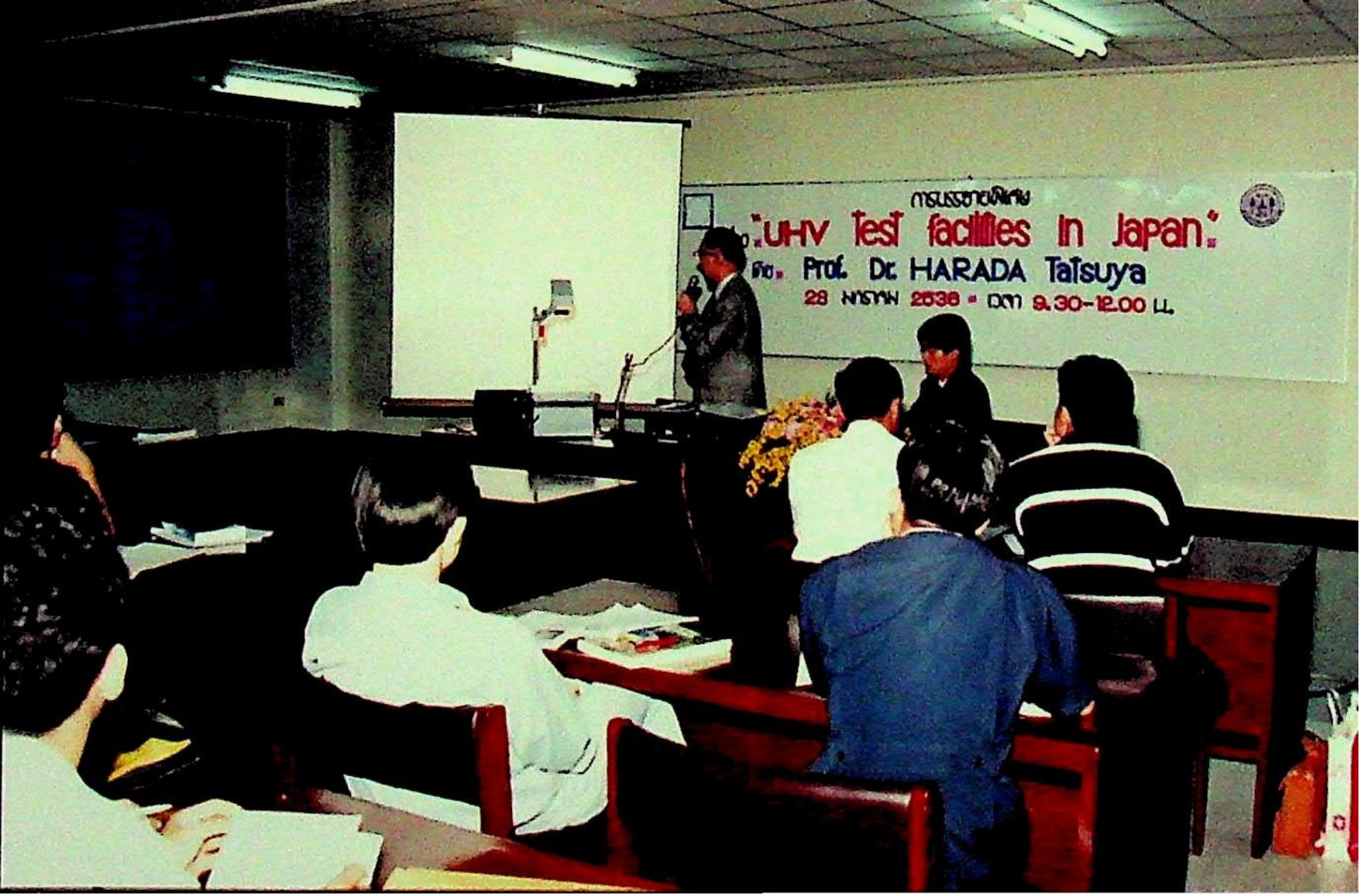 ศาสตราจารย์ ดร.ทัตสึยะ ฮาราดะ จากภาควิชาวิศวกรรมไฟฟ้า สถาบันเทคโนโลยีนิปปอน ประเทศญี่ปุ่น บรรยายพิเศษเรื่อง ห้องปฏิบัติการไฟฟ้าแรงสูง ณ ห้องสัมมนา ชัน 3 อาคารสัมมนา ในวันพฤหัสบดีที่ 28 มกราคม 2536 จากภาพถ่ายอัลบั้มที่ 367