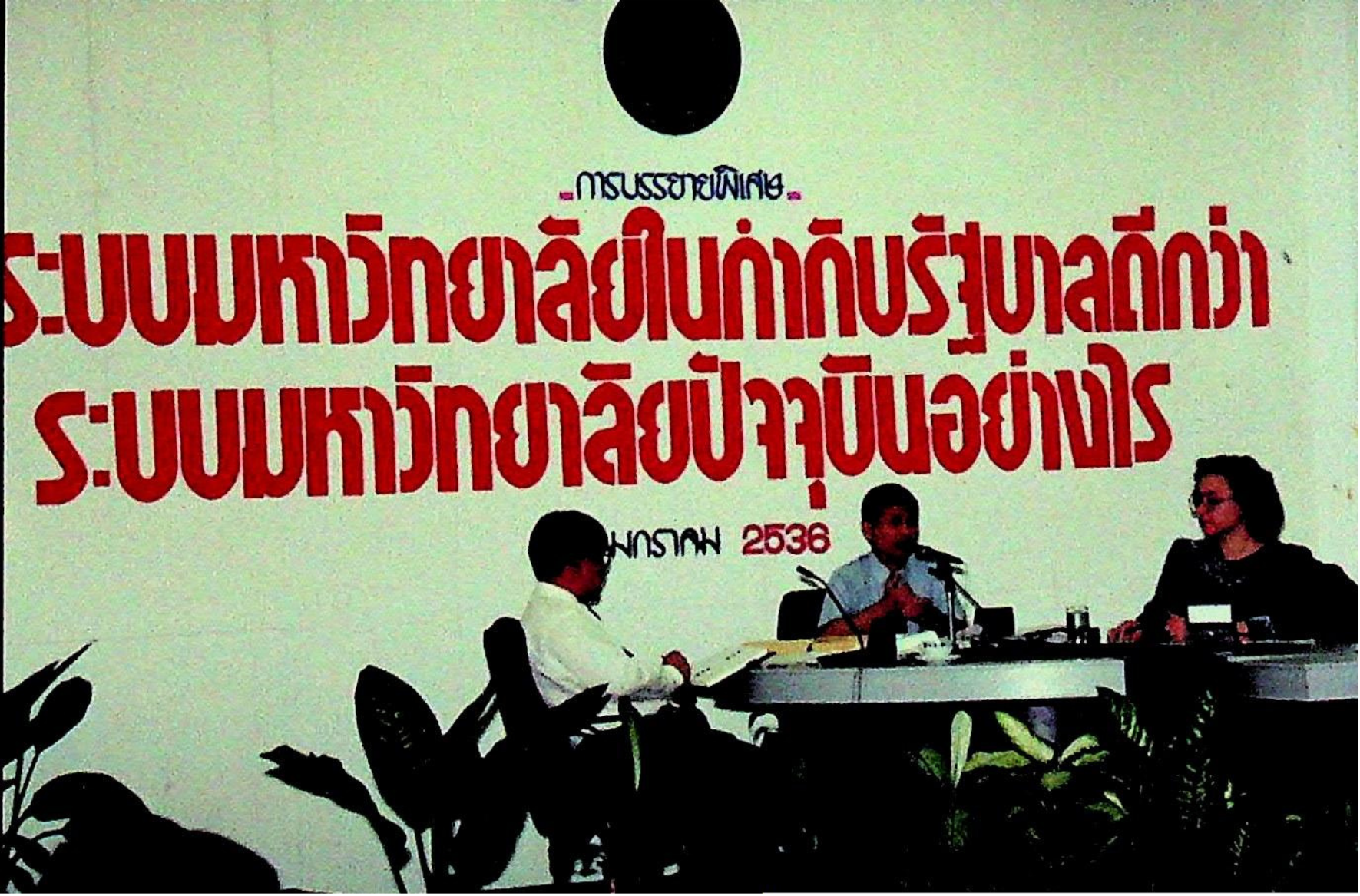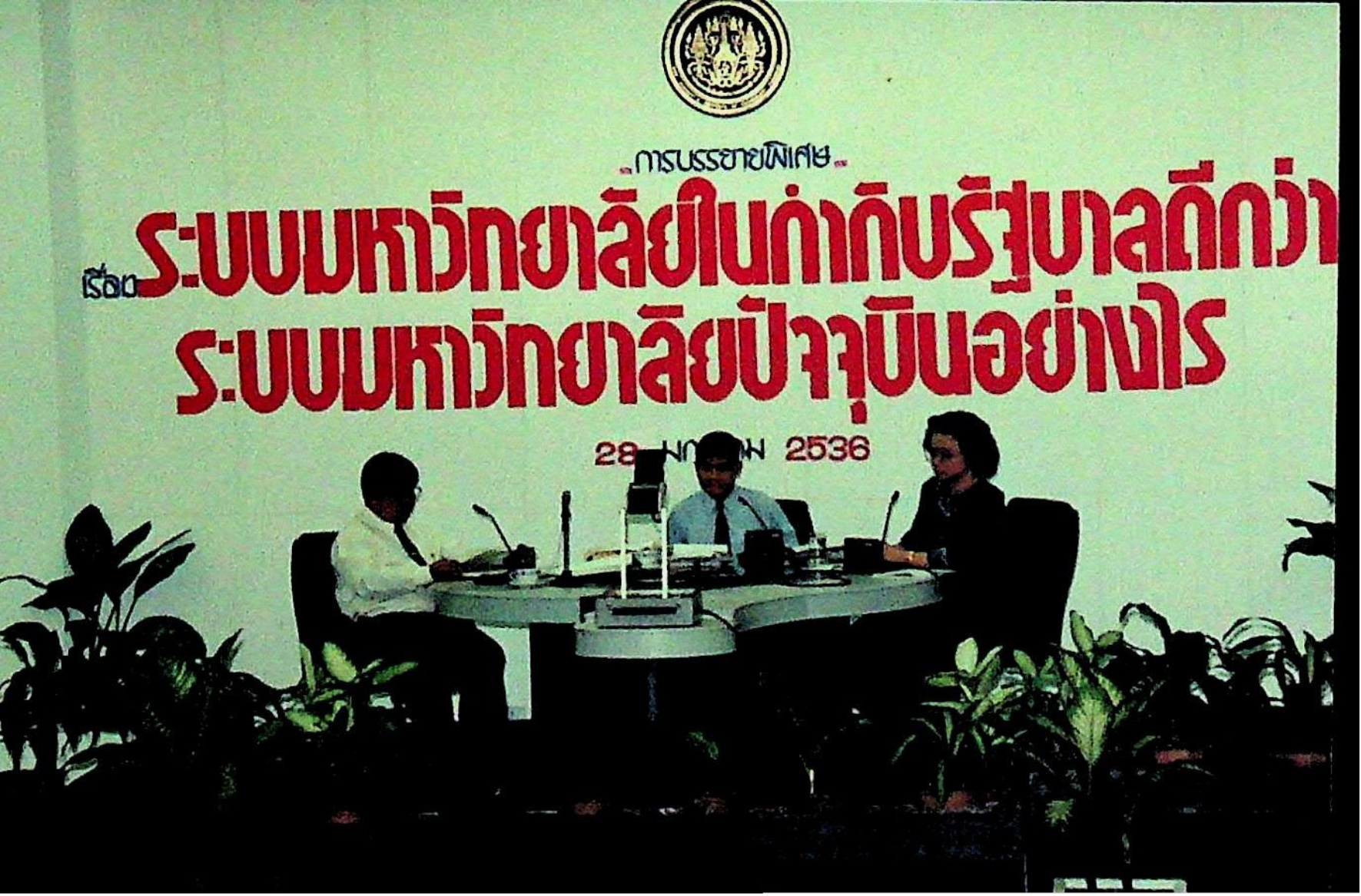 รศ.ดร.หริส สูตะบุตร อธิการบดี ดร.เกษรา วามะศิริ รองอธิการบดีฝ่ายวางแผนและพัฒนา และ รศ.อดิศักดิ์ พงษ์พูลผลศักดิ์ บรรยายพิเศษเรื่อง ระบบมหาวิทยาลัยในกำกับรัฐบาลดีกว่าระบบมหาวิทยาลัยปัจจุบันอย่างไร ณ ห้องประชุมจำรัส ในพฤหัสบดีที่ 28 มกราคม 2536 จากภาพถ่ายอัลบั้มที่ 367