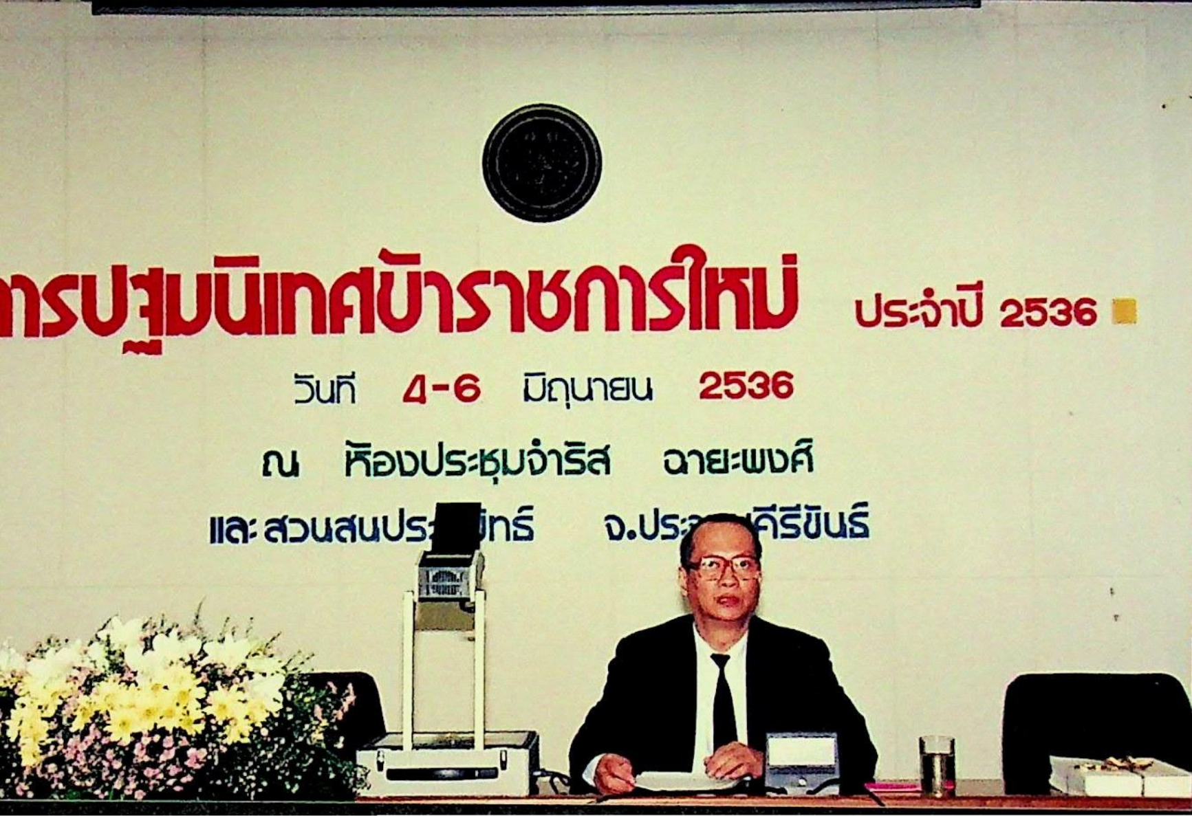 รศ.ดร.หริส สูตะบุตร อธิการบดี เป็นประธานเปิดการสัมมนาข้าราชการใหม่ ซึ่งทางสถาบันจัดขึ้นระหว่างวันที่ 4-6 มิถุนายน 2536 ณ ห้องประชุมจำรัส ฉายะพงศ์ และสวนสนประดิพัทธ์ จ.ประจวบคีรีขันธ์ จากภาพถ่ายอัลบั้มที่ 3632 และ 3633